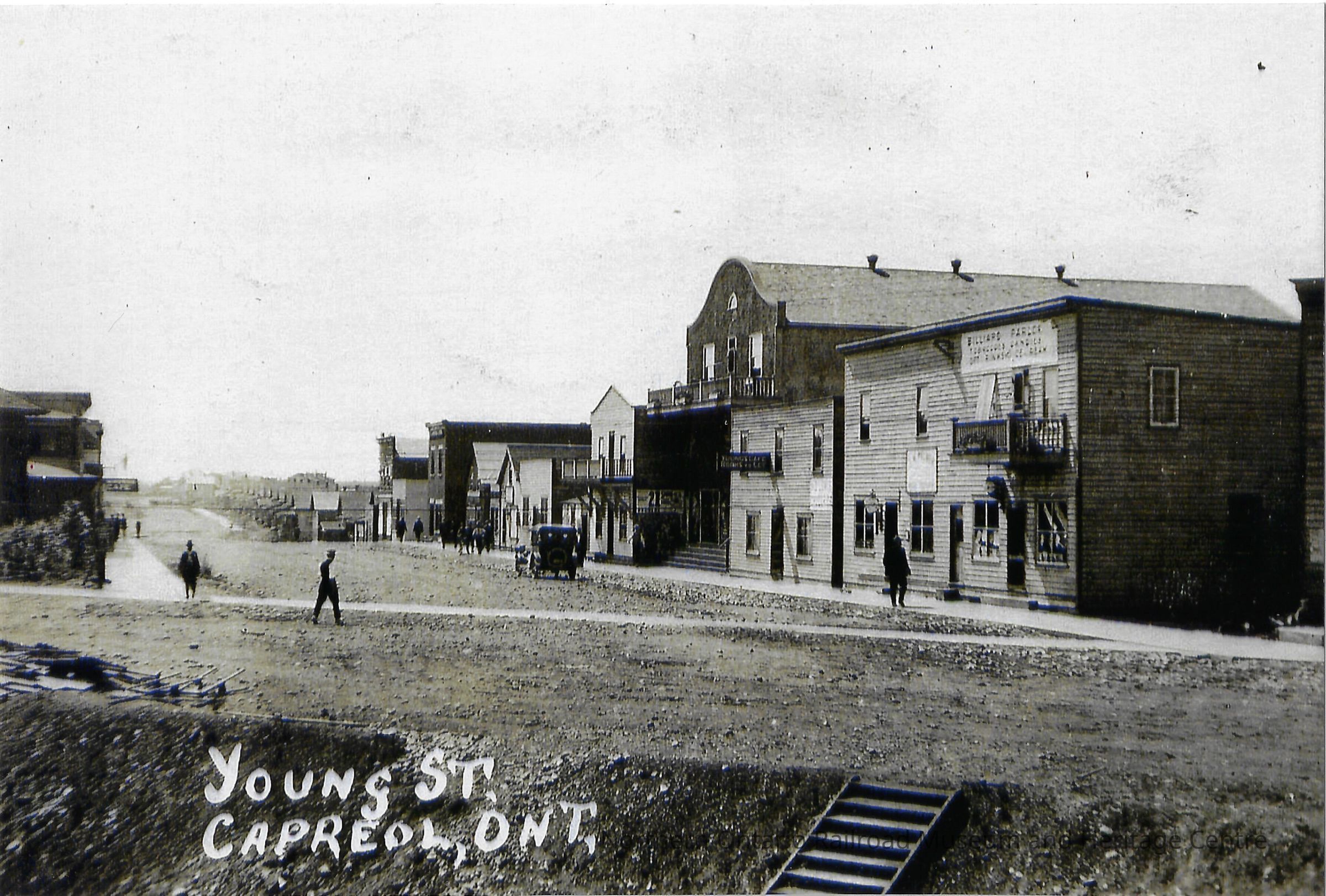 A black and white photograph of Young Street, Capreol Ontario, in the 1920s. The photo is taken from the near side of Front Street (which runs diagonally left to right in the foreground) looking South East. On the right, the first building in the foreground is what is now (current, 2019) the M & R restaurant on Young Street (near Front Street). At the time of the photograph, it housed a billiard parlour, apartments and a dance hall upstairs. There is no gas pump out front, which dates the photo to pre-1922 (a single gas pump was installed in 1922). To the left of this building (from the perspective of the person looking at the photograph) is the Audion theatre. There is a single car on the dirt/gravel road in front, and two figures are visible, one walking down the side of the street, one crossing.Collection