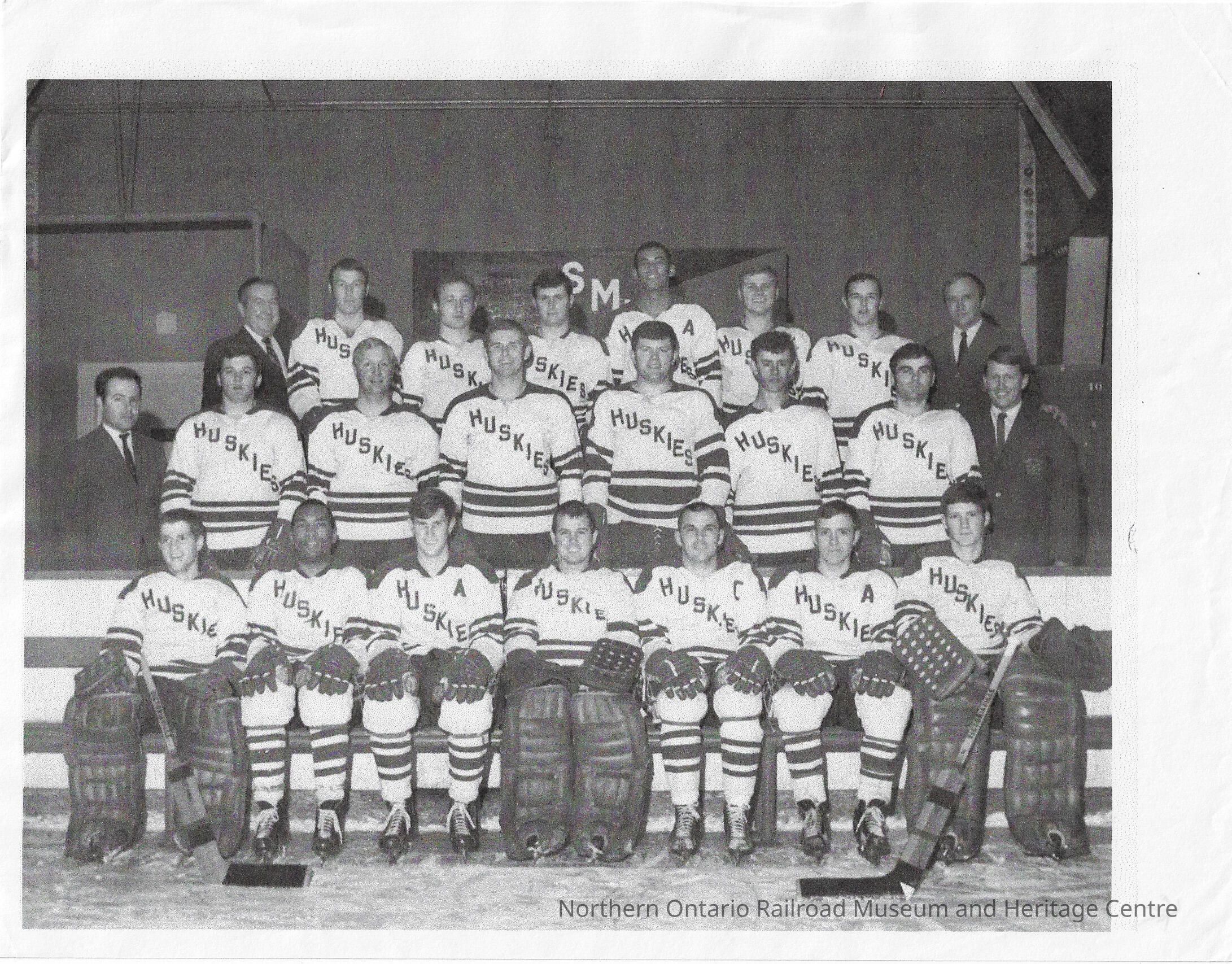 Copy of a black and white team photograph of the St Mary's Huskies University hockey team in the 1970-1971 season. The players are pictured in full hockey equipment, with a the name "Huskies" on the chest of their primarily white jerseys. They are arranged in three rows, with the front sitting and the back two rows standing. Also pictured are the team coaches/staff, dressed in suits. There is no identifying information to accompany the photo, but Ron Hindson has been identified as the player standing third from the left in the second row.Context