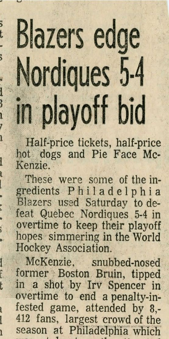 "Blazers edge nordiques 5-4 in playoff bid" in unknown newspaper. Highlighted paragraph is assumed to be Ray Thomas as referee of game.Collection
