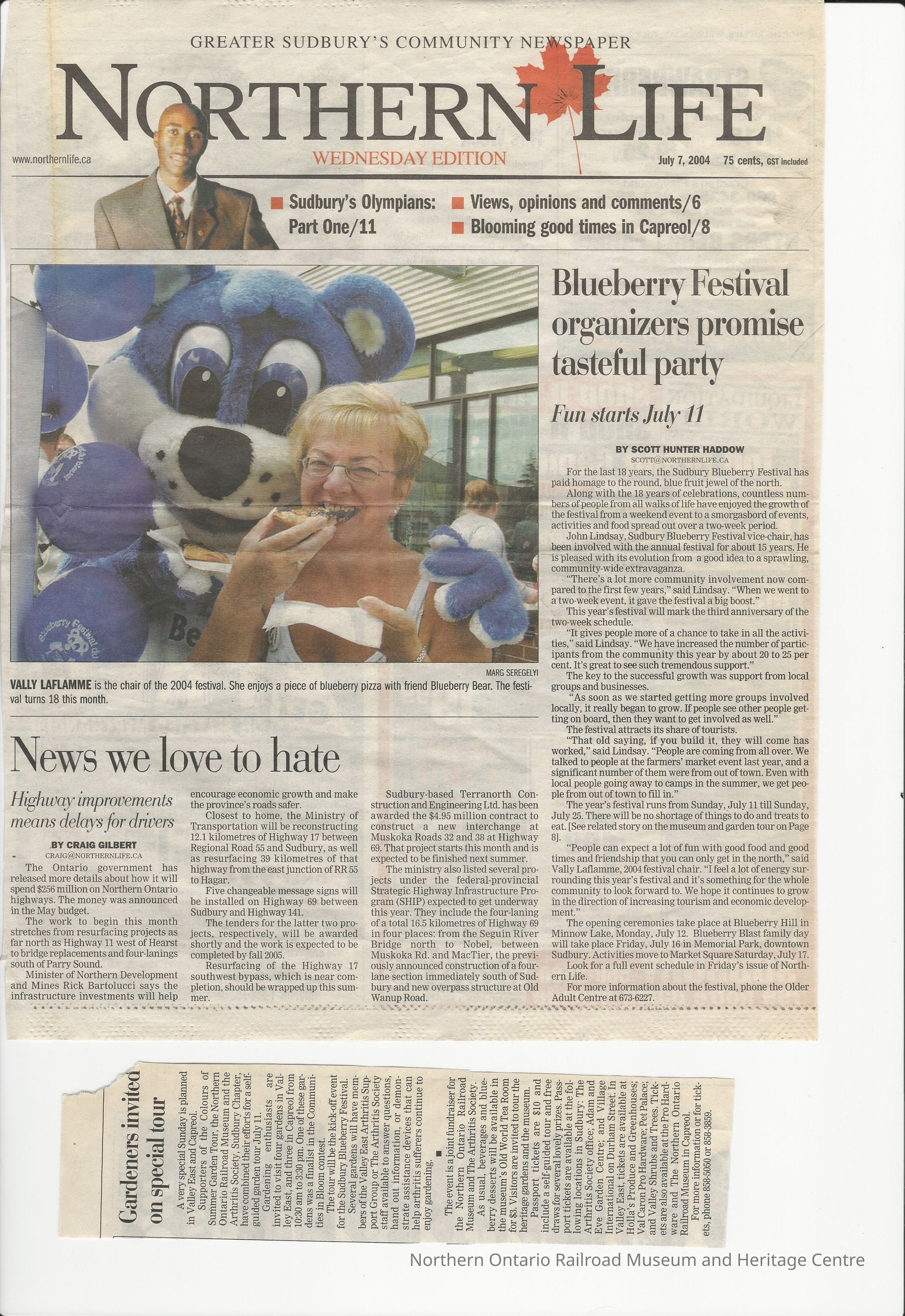"Blueberry Festival Organizers Promise Tasteful Party" in Northern Life, July 7, 2004. Features all of the activities around Sudbury, Capreol as well as ad for garden tour during festival at NORMHCCollection