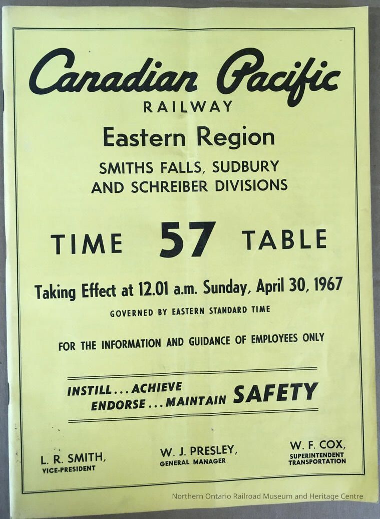 Booklet: Canadian Pacific Railway Eastern Region smiths Falls, Sudbury and Schreiber Divisions Time table 57, 1967Entry/Object ID