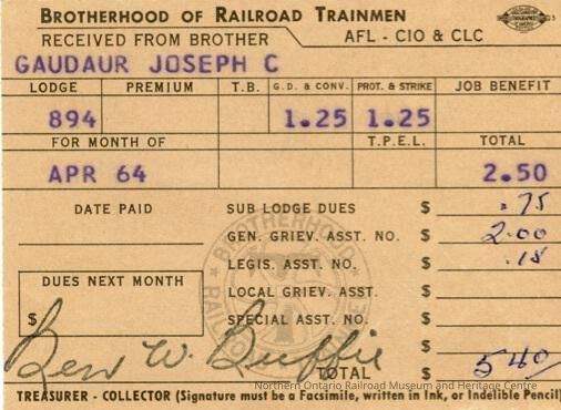 Brotherhood of Railroad Trainmen Lodge 894, Receipt for Dues, Joseph C. Gaudaur, April 1964Entry/Object ID