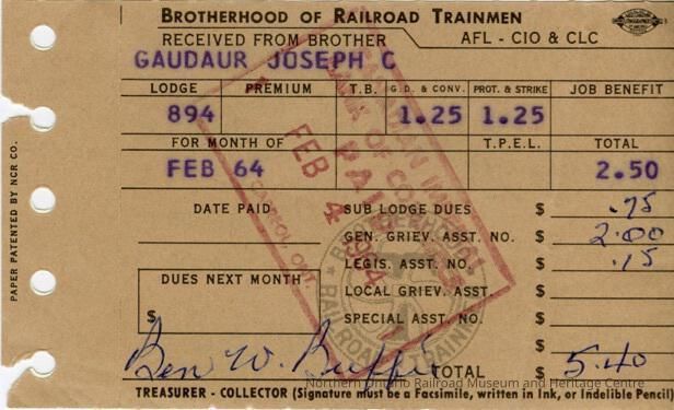 Brotherhood of Railroad Trainmen Lodge 894, Receipt for Dues, Joseph C. Gaudaur, February 1964Entry/Object ID