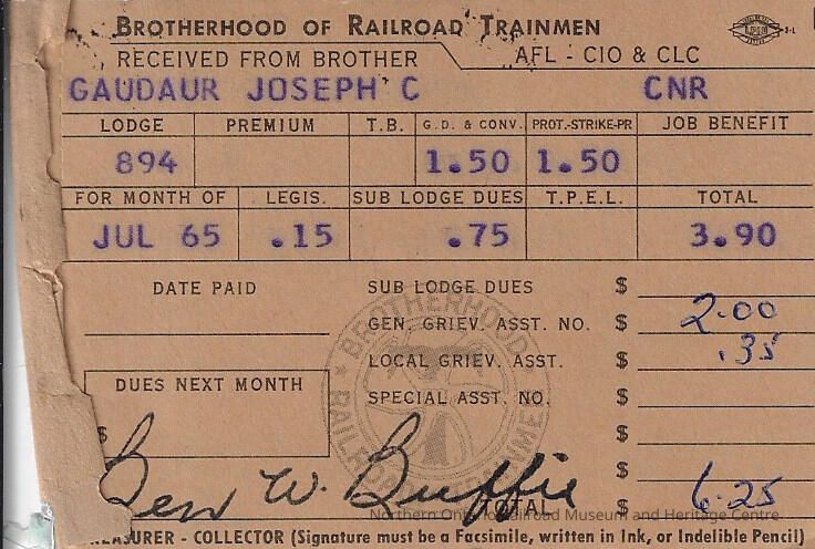 Brotherhood of Railroad Trainmen Lodge 894, Receipt for Dues, Joseph C. Gaudaur, July 1965Entry/Object ID