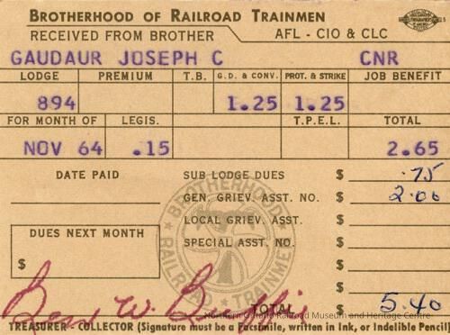 Brotherhood of Railroad Trainmen Lodge 894, Receipt for Dues, Joseph C. Gaudaur, November 1964Entry/Object ID