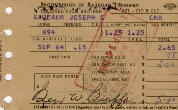 Brotherhood of Railroad Trainmen Lodge 894, Receipt for Dues, Joseph C. Gaudaur, September 1964Entry/Object ID