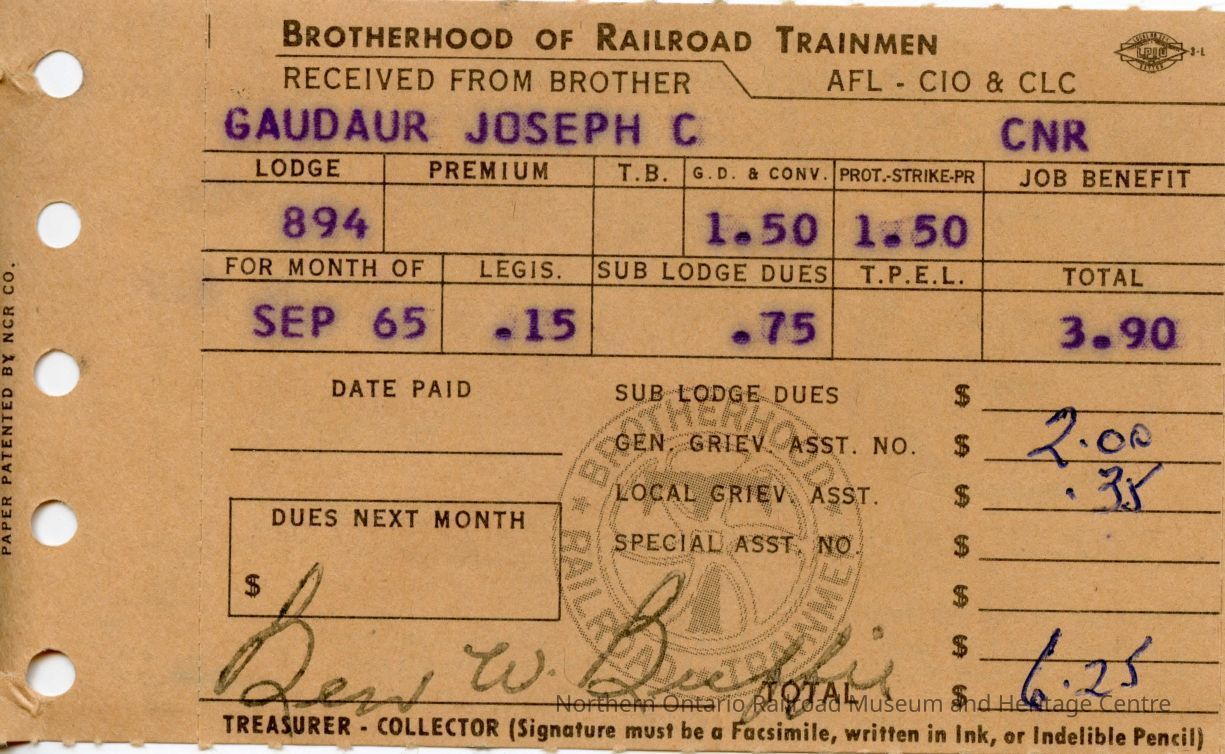 Receipt, Documentary, Canadian National, Joseph C. Gaudaur, Union, Brotherhood of Railroad Trainmen, Capreol, OntarioScope and Content