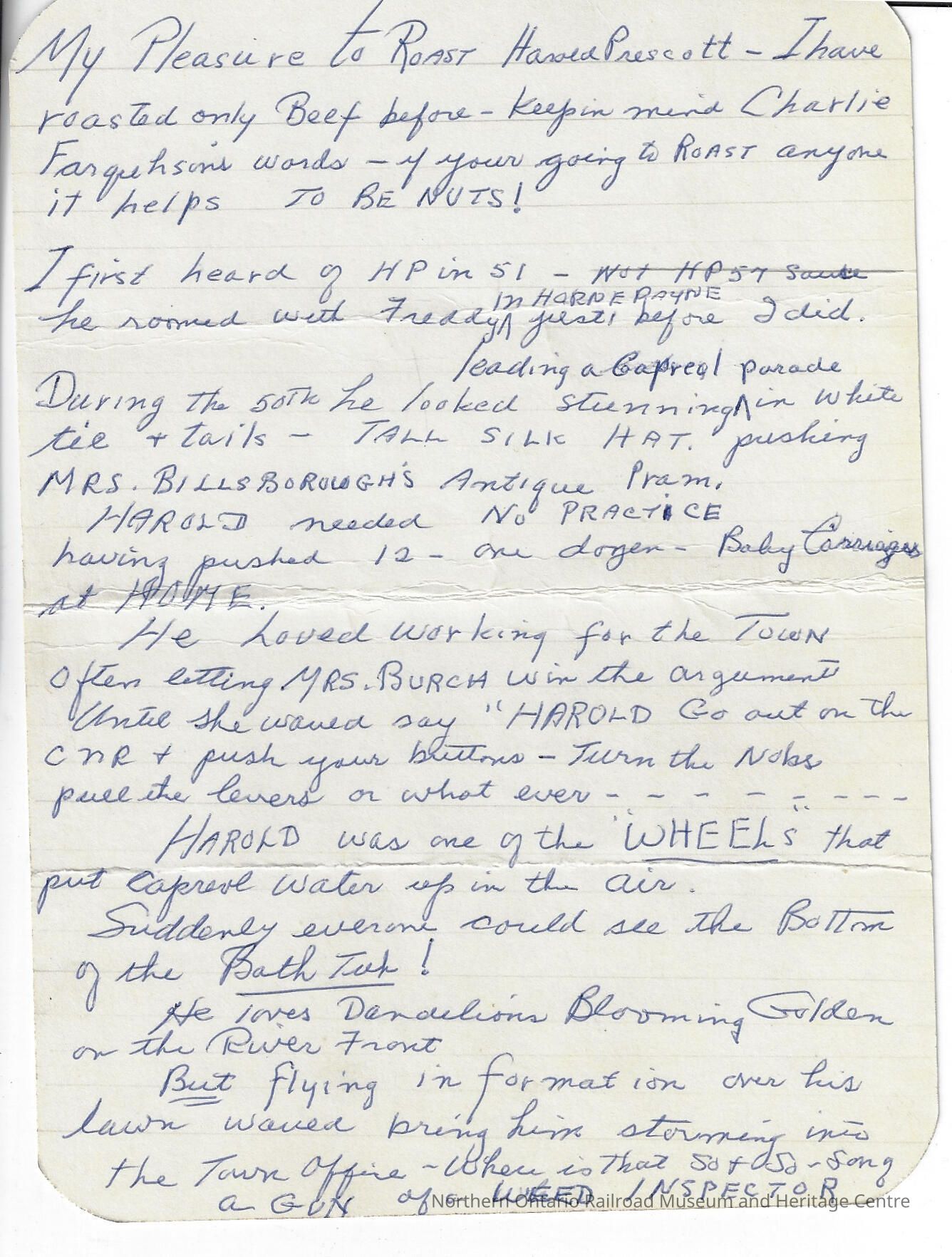 Original document used by C. H. Johnson to record his roast of Harold Prescott.