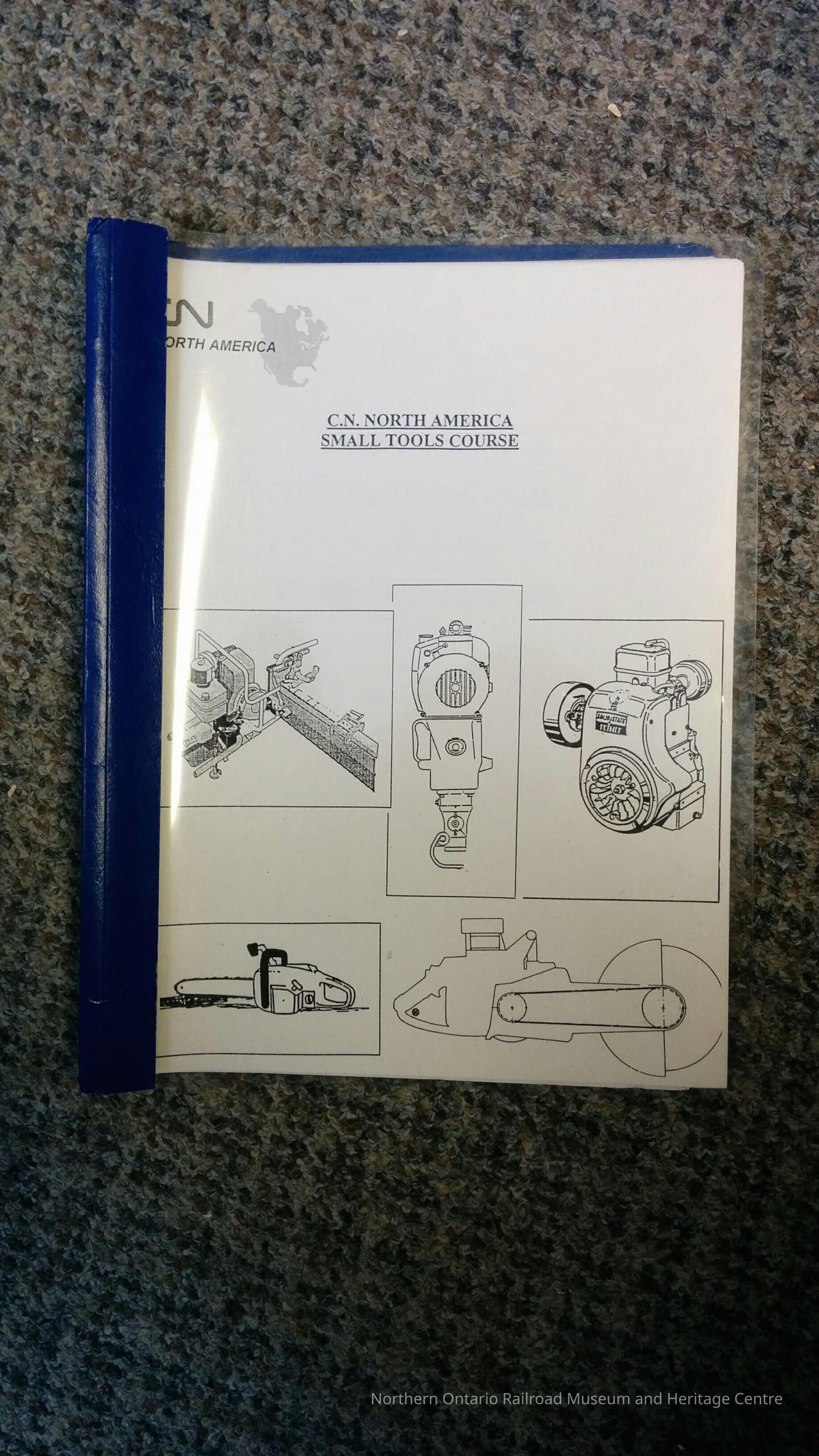 Book, training manual for Canadian National employees on small tools operation. It covers the operation of: rail saws, rail drills, impact wrenches, hand tampers, brush saws, chain saws, snow blowers. It showcases how to operate these types of tools and the health and safety concerns surrounding their operation.