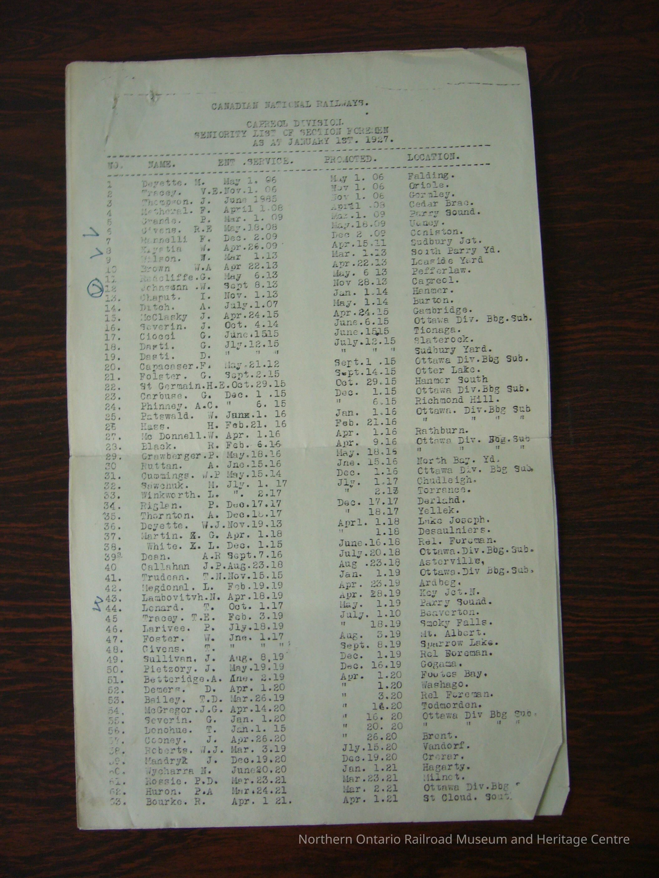 Canadian National Railways Capreol Division Seniority List of Section Foremen As at January 1st, 1927.Collection