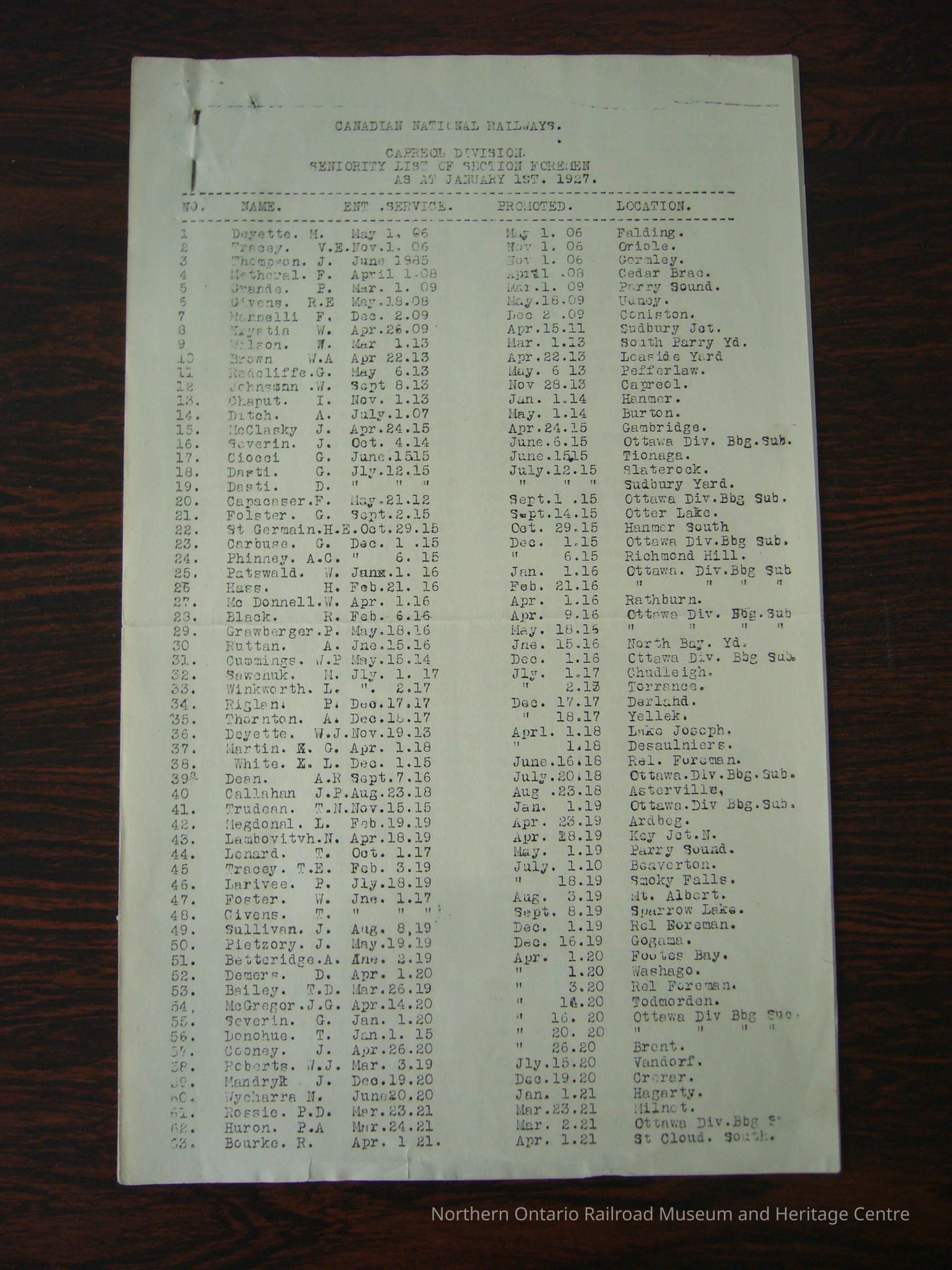 Canadian National Railways, Capreol Division, Seniority List of Section Foremen as at January 1st, 1927Description