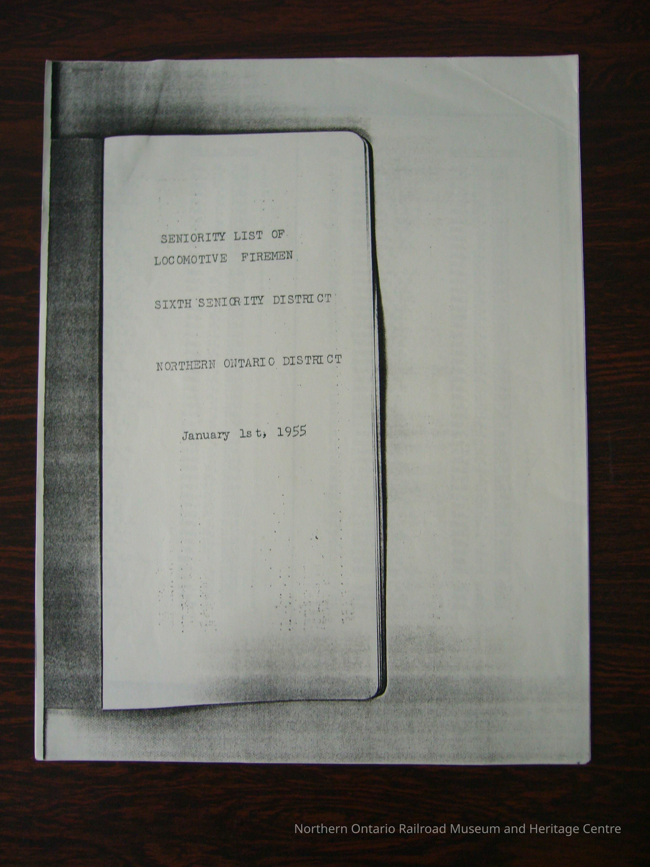 Seniority List of Locomotive Firemen, Sixth Seniority District, Northern Ontario District, January 1st, 1955Collection