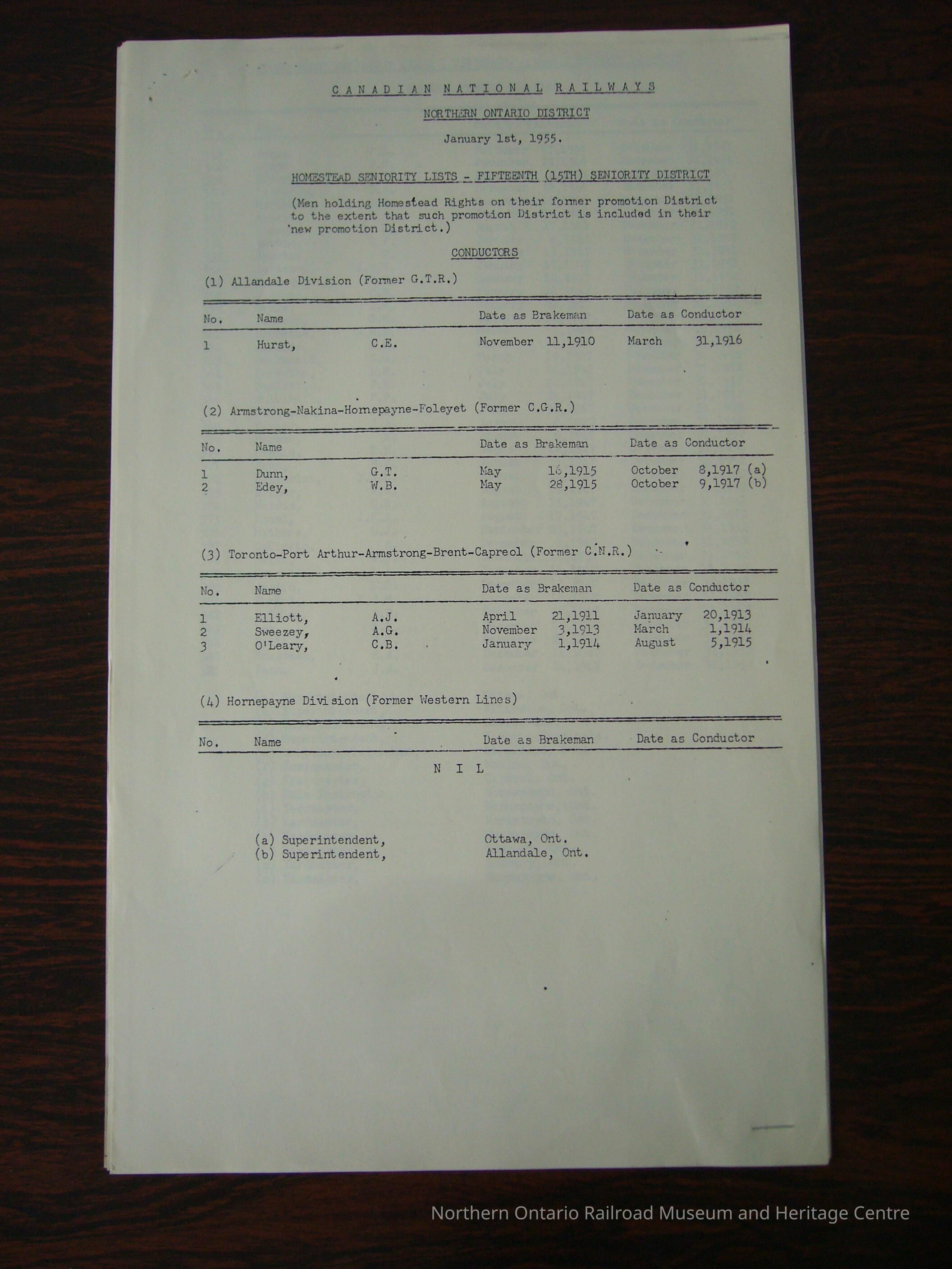 Canadian National Railways, Northern Ontario District, Conductors' and Homestead Seniority Lists, Fifteenth Seniority District, Januay 1st, 1955.Collection