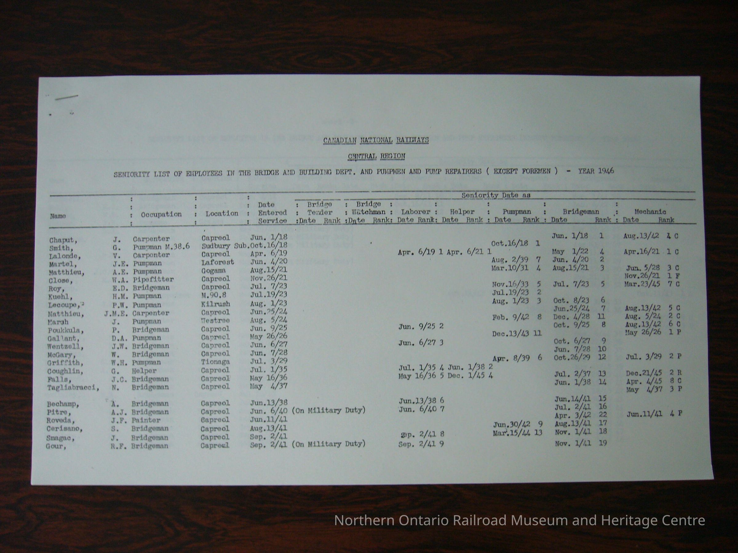 Canadian National RailwaysSeniority List of Employees in the Bridge and Building Department and Pumpmen and Pump Repairers (Except Foremen) 1946 and Seniority List of Foremen in Track Department 1935Description