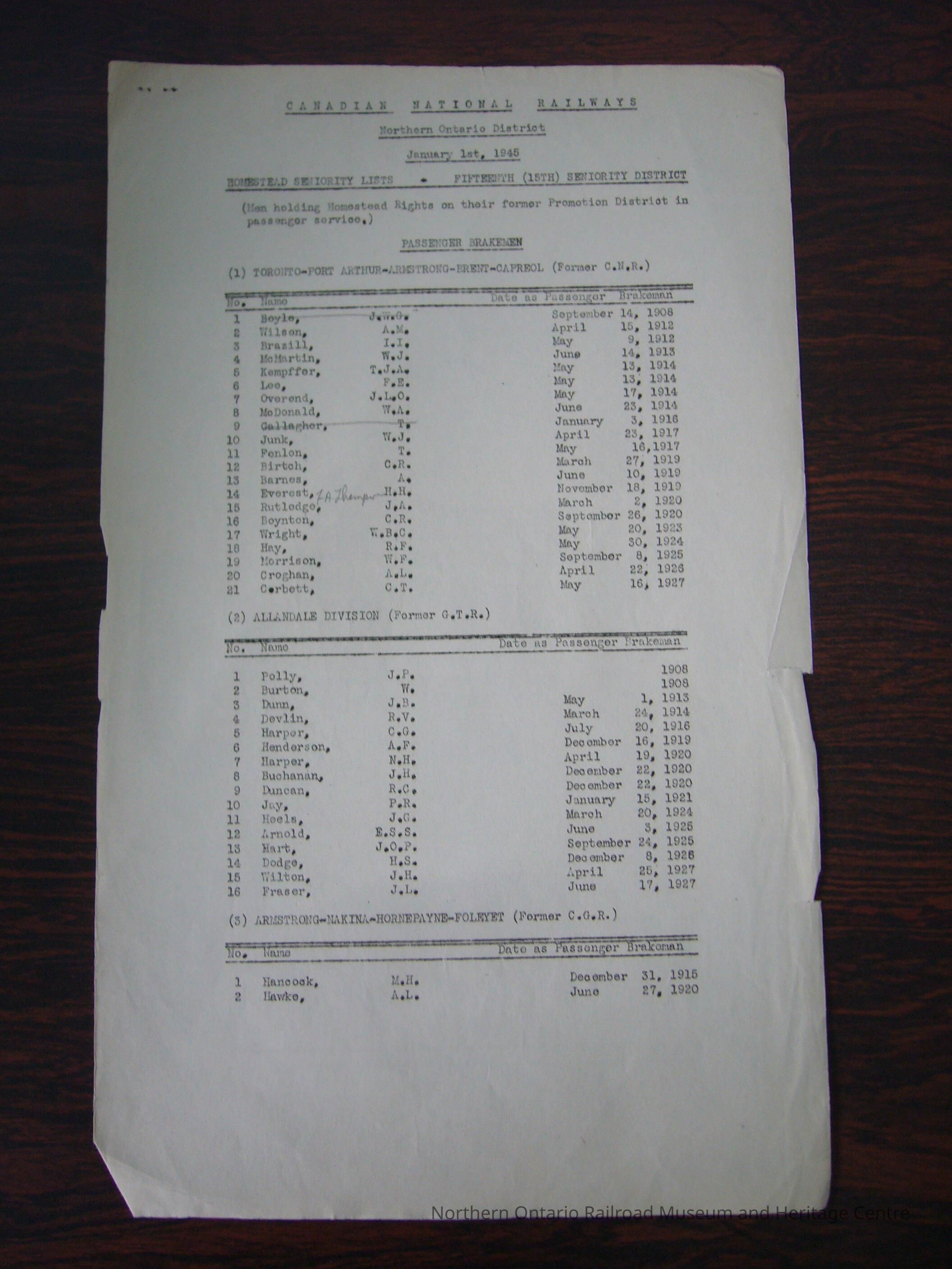 Canadian National Railways Northern Ontario District, January 1st, 1945 Homestead Seniority Lists, Fifteenth Seniority DistrictDescription