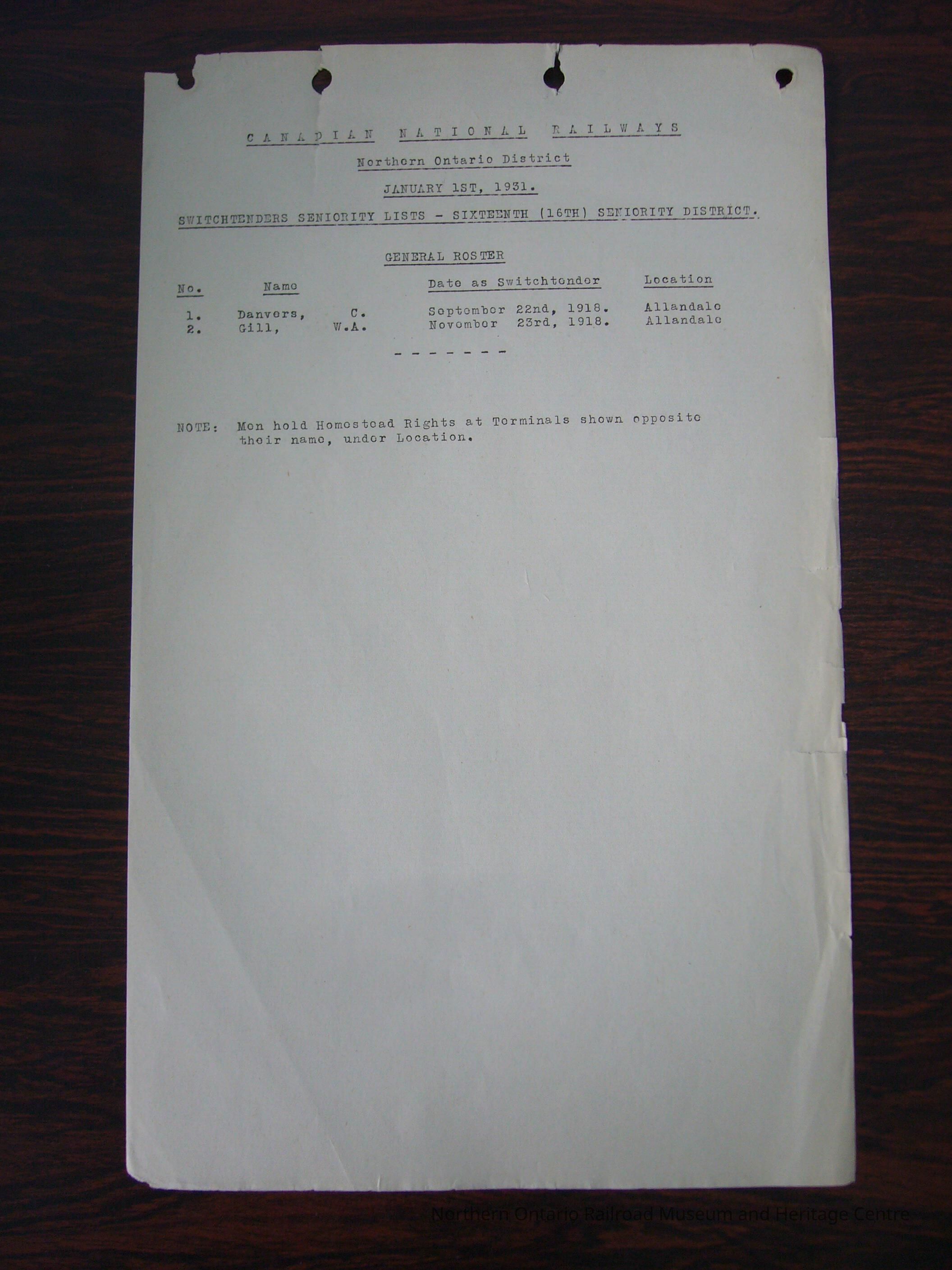 Canadian National Railways, Northern Ontario District, January 1st, 1931 Switchenders Seniority Lists - Sixteenth Seniority District, General Roster.Collection