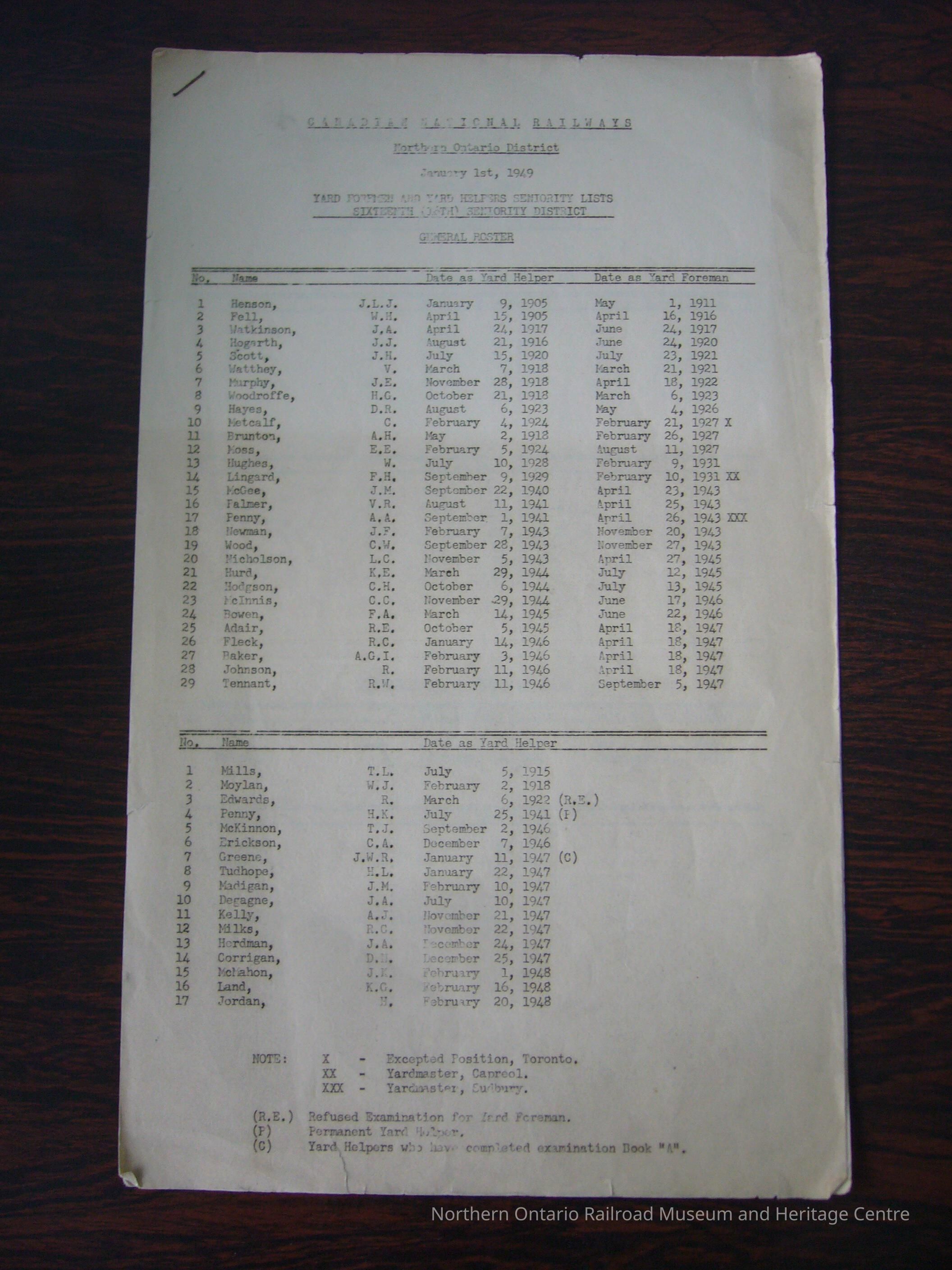Canadian National Railways, Northern Ontario District, January 1st, 1949 Yard Foremen and Yard Helpers Seniority Lists, Sixteenth Seniority District, General RosterDescription