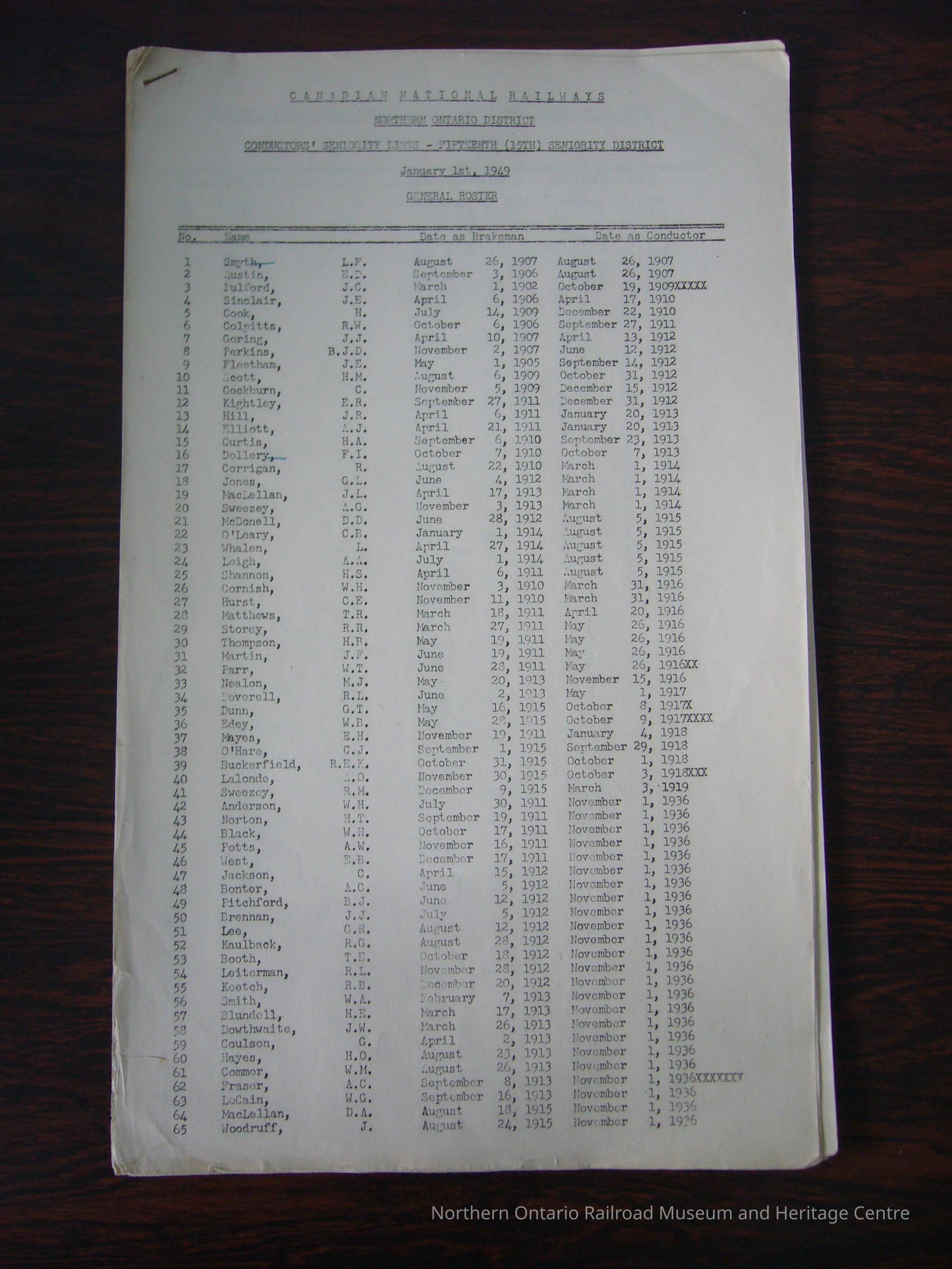 Canadian National Railways Northern Ontario District Conductors' Seniority Lists - Fifteenth Seniority District, January 1st, 1949 General Roster.Collection