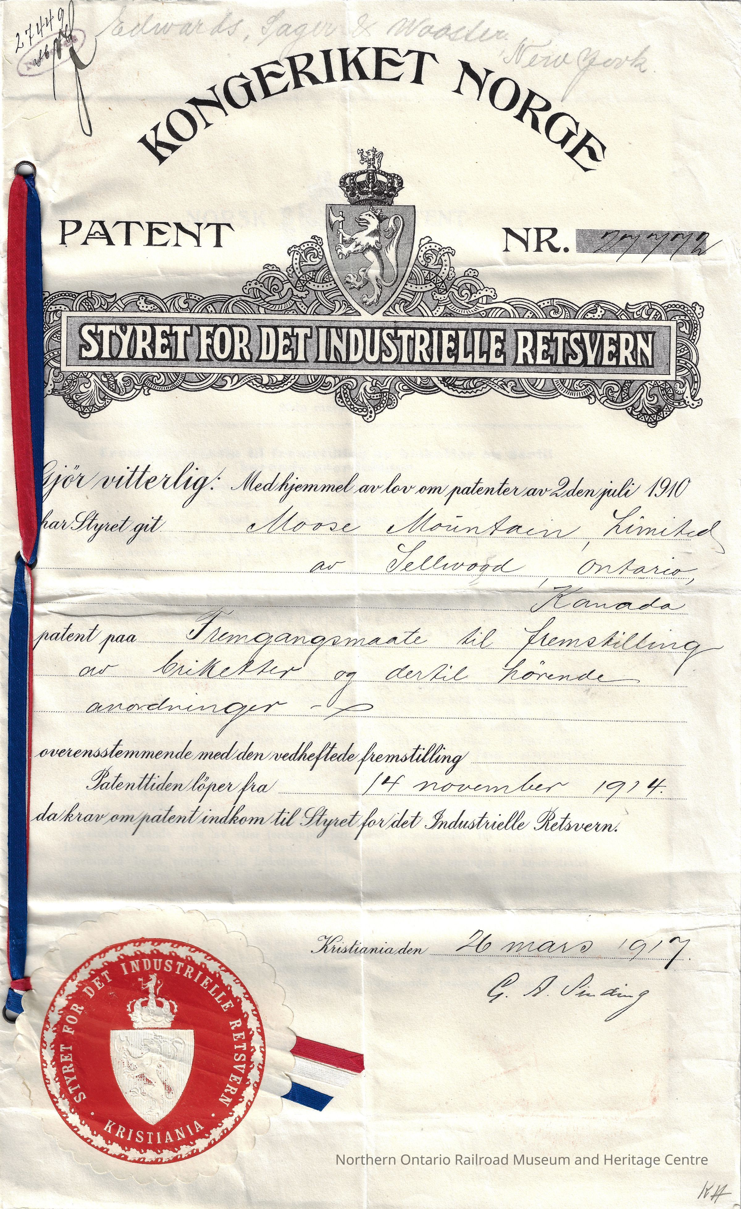 Norwegian Patent No 27772, 1917, Fred A. Jordan, Methods of Making Briquets, Kingdom of Norway (Kongeriket Norge) Stockholm, March 26th 1917 (Attached Letter, Julian S. Wooster, Counselor at Law, May 9th 1917)Entry/Object ID