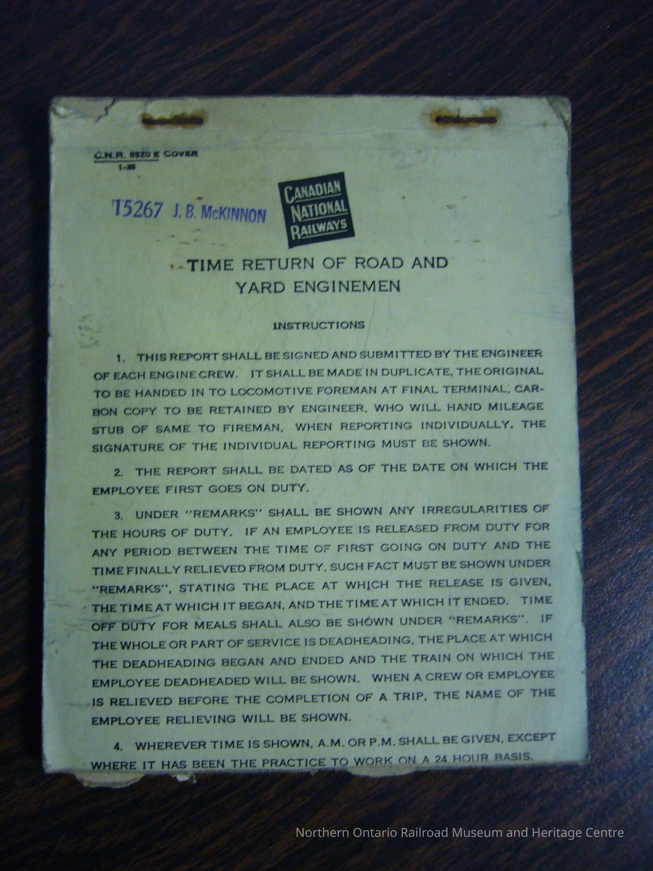 Canadian National Railways Time Return of Road and Yard EnginemenDescription
