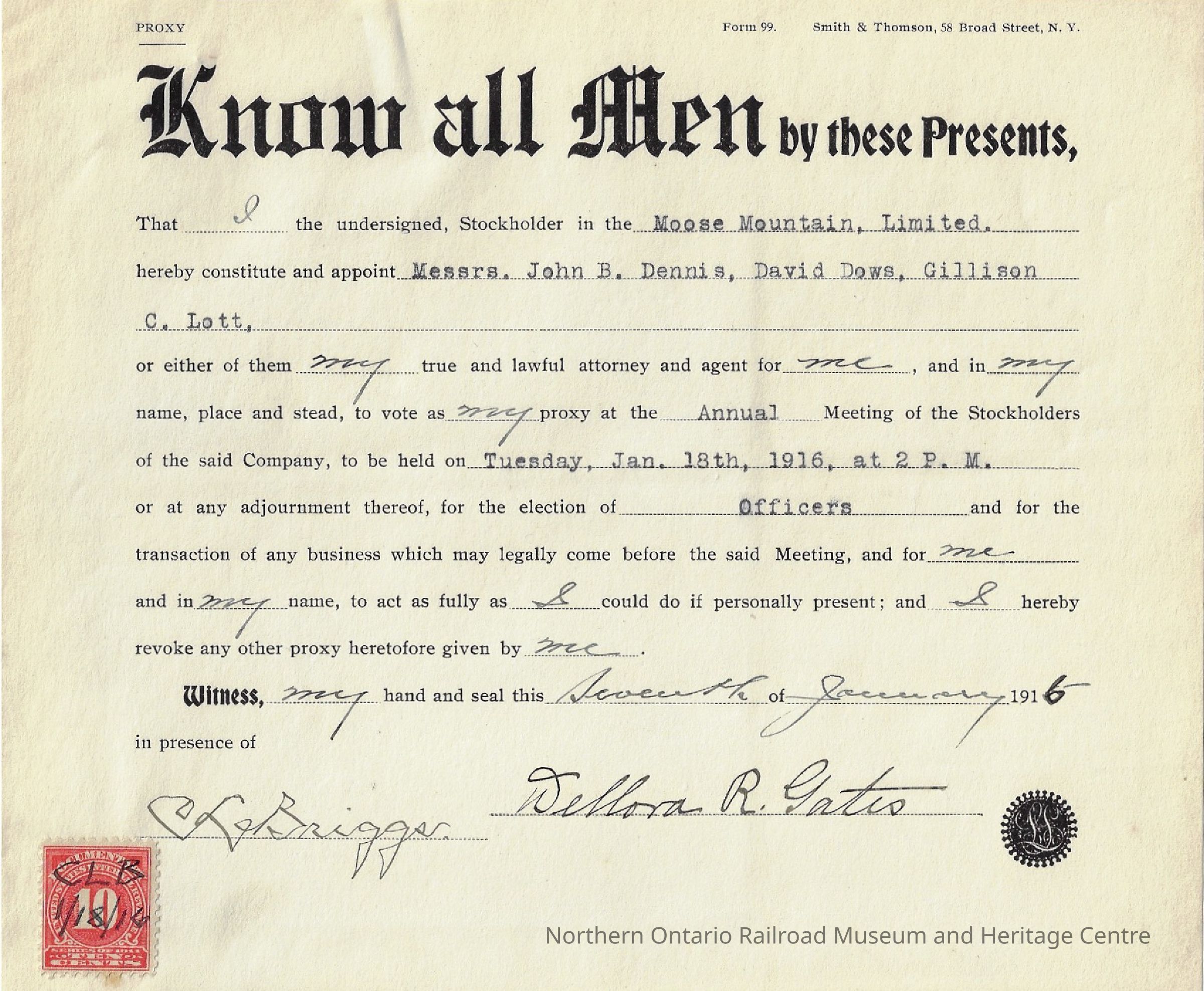Proxy Form, for Annual Meeting of the Stockholders, Moose Mountain Limited, 1916. C.L. Briggs. Shareholder Dellora R. Gates, Witness C.L. Briggs. Form 99 Smith & Thomson, 58 Broad Street N.Y.Entry/Object ID