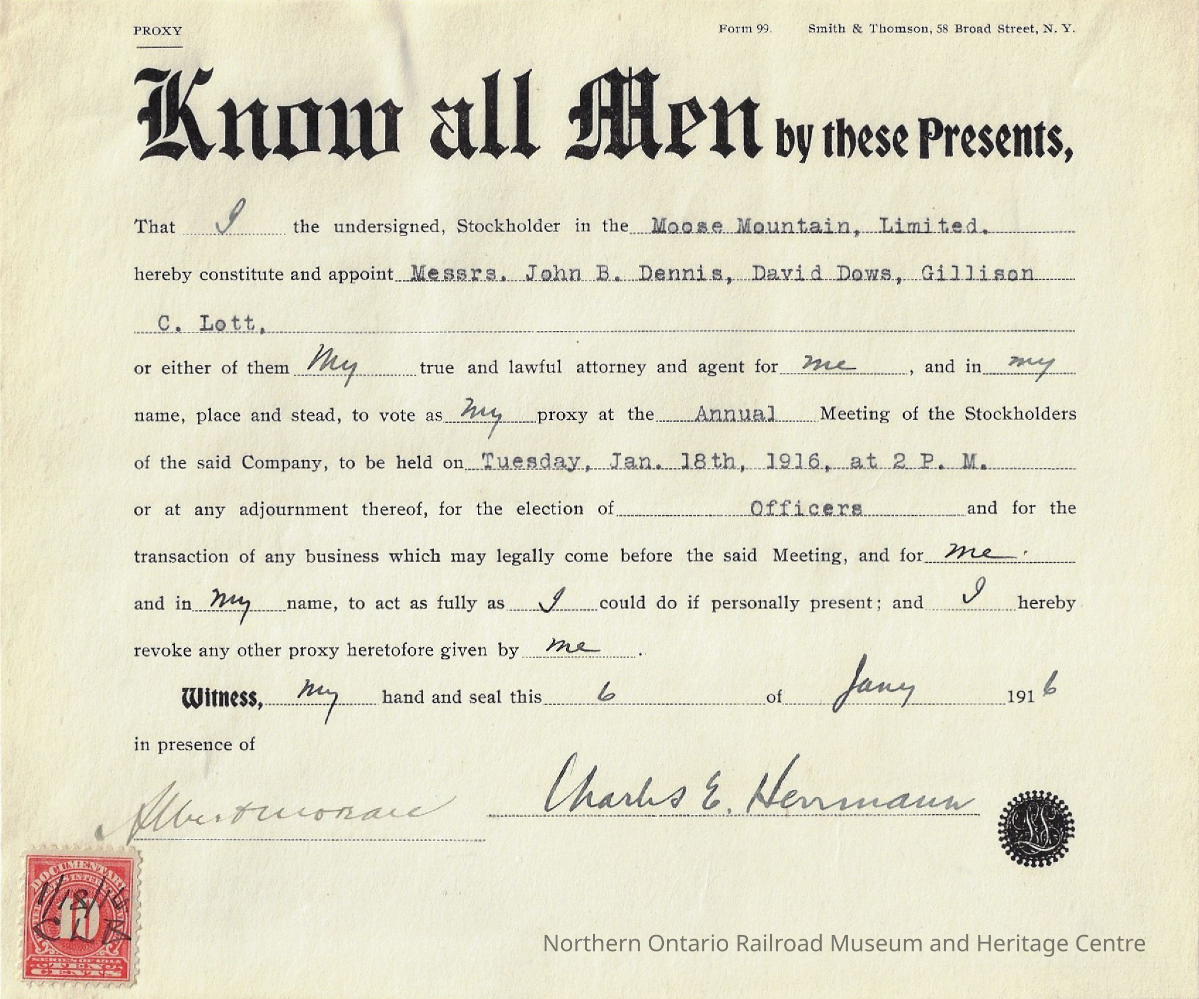 A form appointing Messrs. John B. Dennis, David Dows, and Gillison C. Lott to serve as proxy for shareholder Charles E. Herrmann at the Annual Meeting of the Stockholders of Moose Mountain, Limited, January 18th 1916. Witnessed by Albert [Norman].Collection