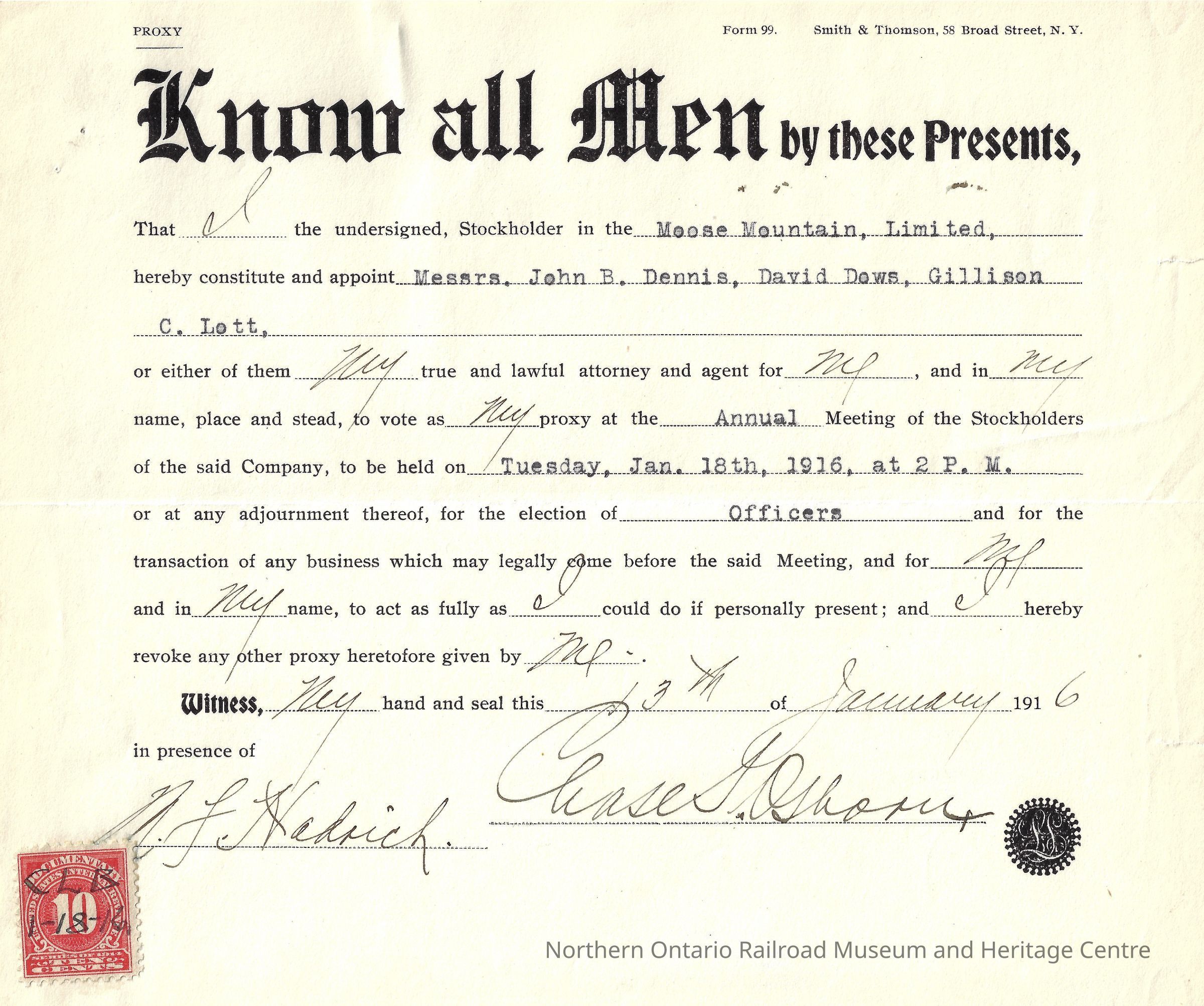 A form appointing Messrs. John B. Dennis, David Dows, and Gillison C. Lott to serve as proxy for shareholder Chase S. Osborn at the Annual Meeting of the Stockholders of Moose Mountain, Limited, January 18th 1916. Witnessed by N.F. HadrichCollection