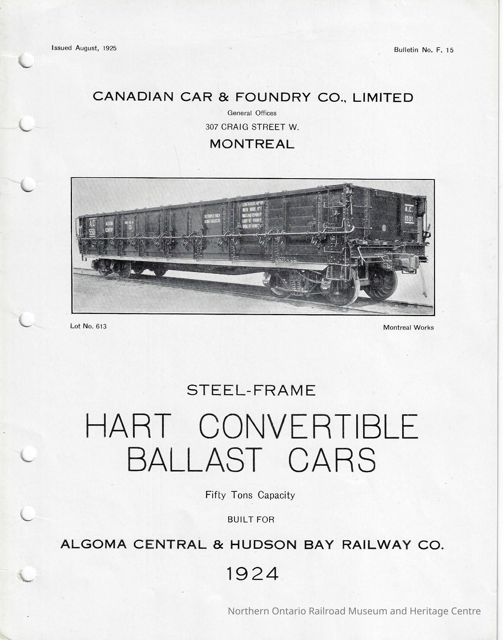Instructive guide published by the Canadian Car & Foundry Co. Limited for steel-frame Hart convertible ballast cars with 50 ton capacities, built for the Algoma Central and Hudson Bay Railway Company, in 1924.