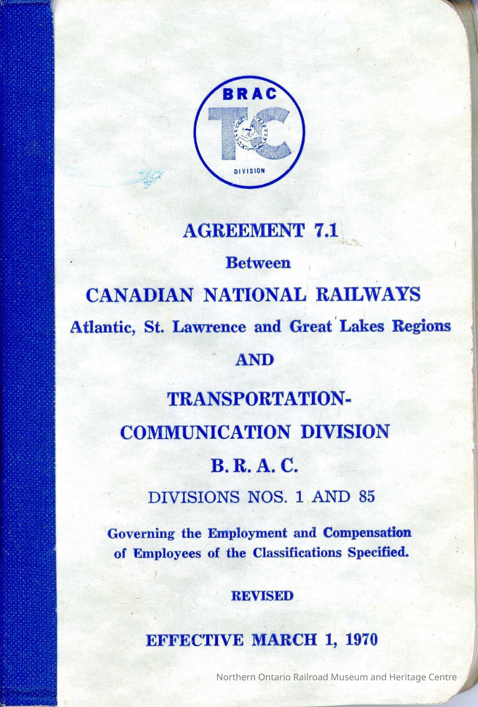 Book, agreement 7.1 between Canadian National's Atlantic, St. Lawrence, and Great Lakes Regions and the Transportation Communication Division BRAC Divisions 1 and 85. The agreement covers employment and the compensation of employees of their specified classifications.