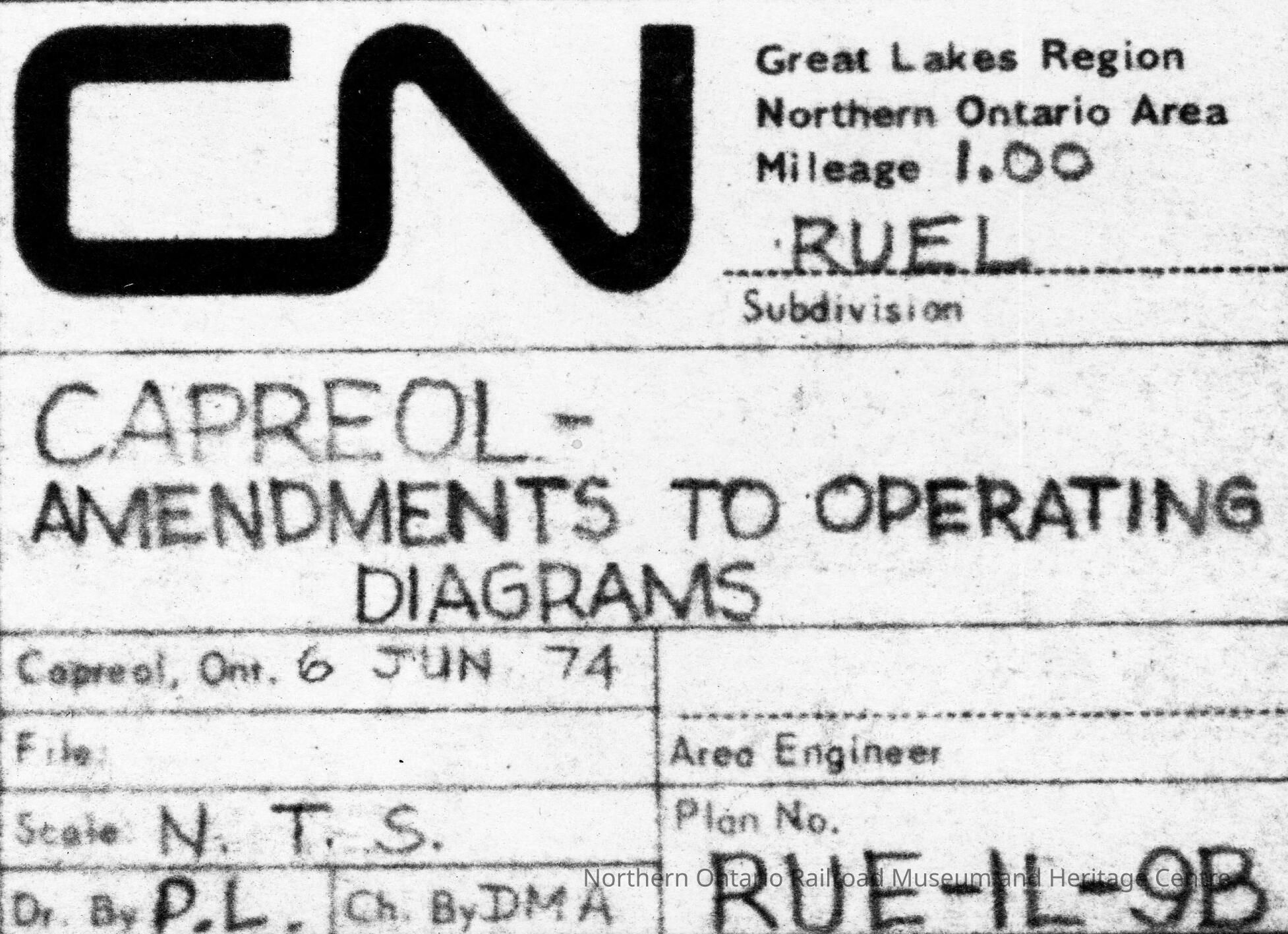 Plan for amendments to operating diagrams in Capreol, at milage 1.00.Creator