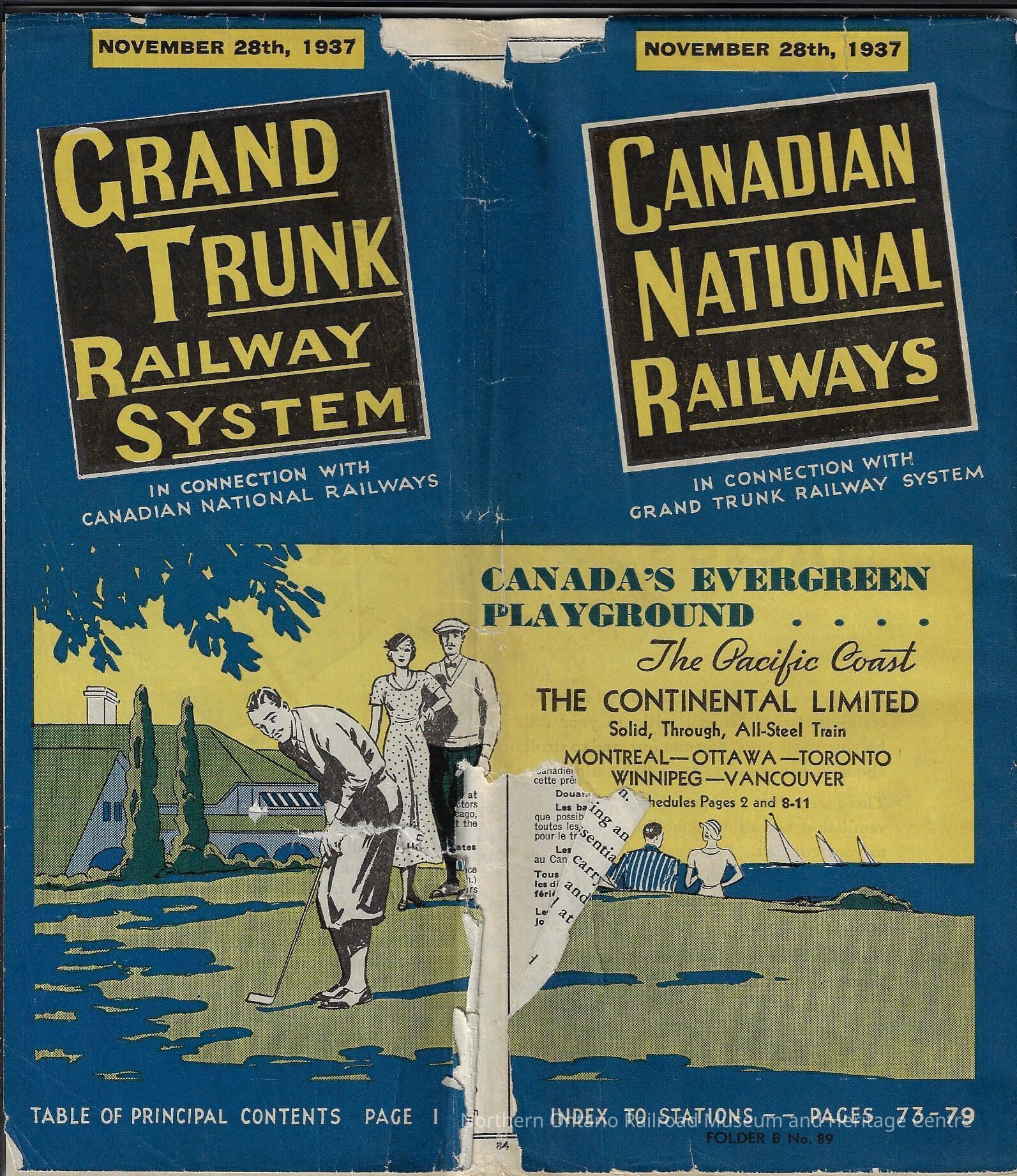 Advertisement and informational booklet marketed to tourists and travelers throughout Canada. It is a combined effort between Canadian National and their newly purchased Grand Trunk. It includes an index of stations as well as popular tourist attractions surrounding each station.