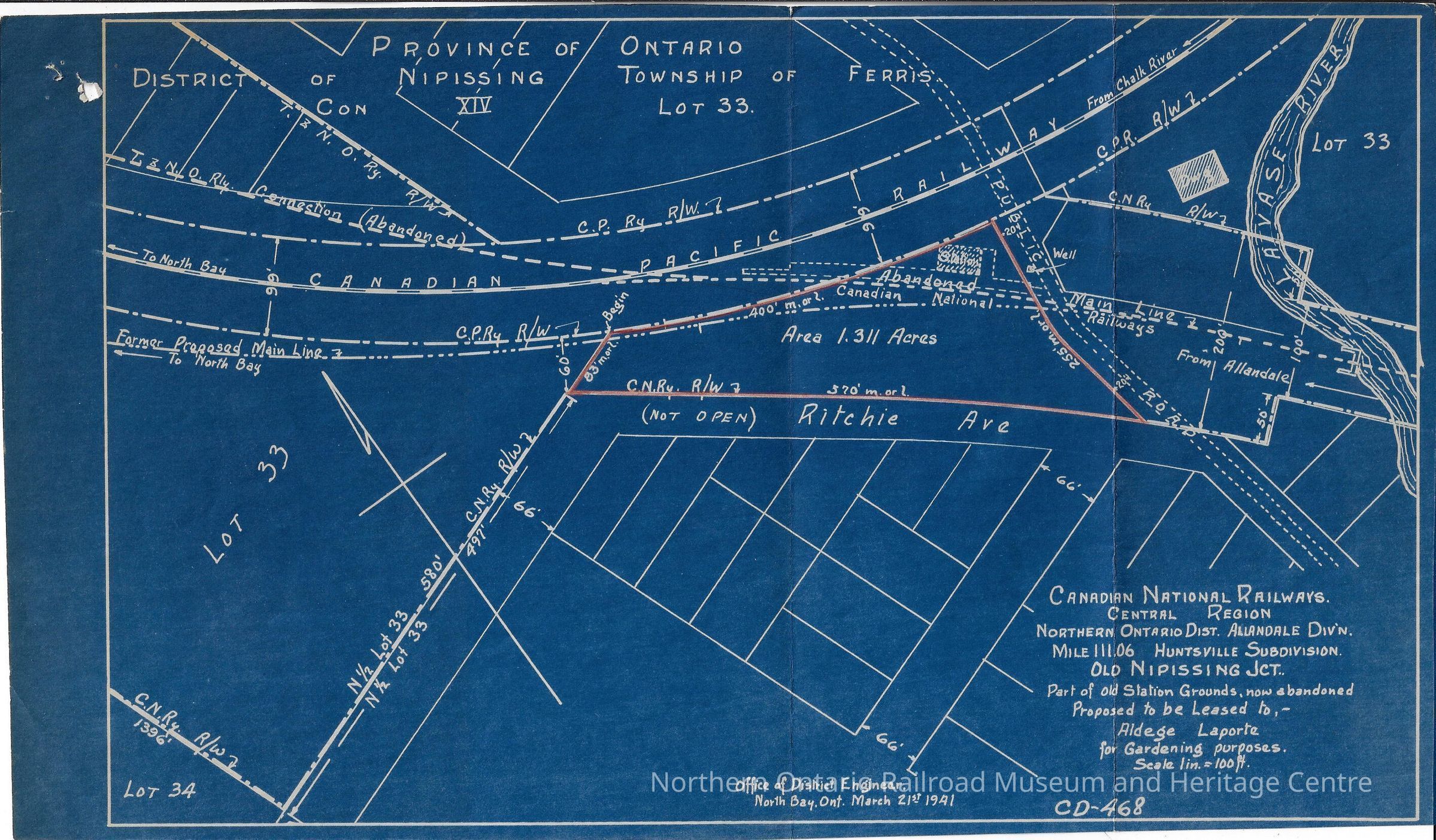 It shows the Old Nipissing Junction, as well as part of the old station grounds which were abandoned at the time the print was drawn. The area was proposed to be leased to Aldege Laporte for gardening purposes.