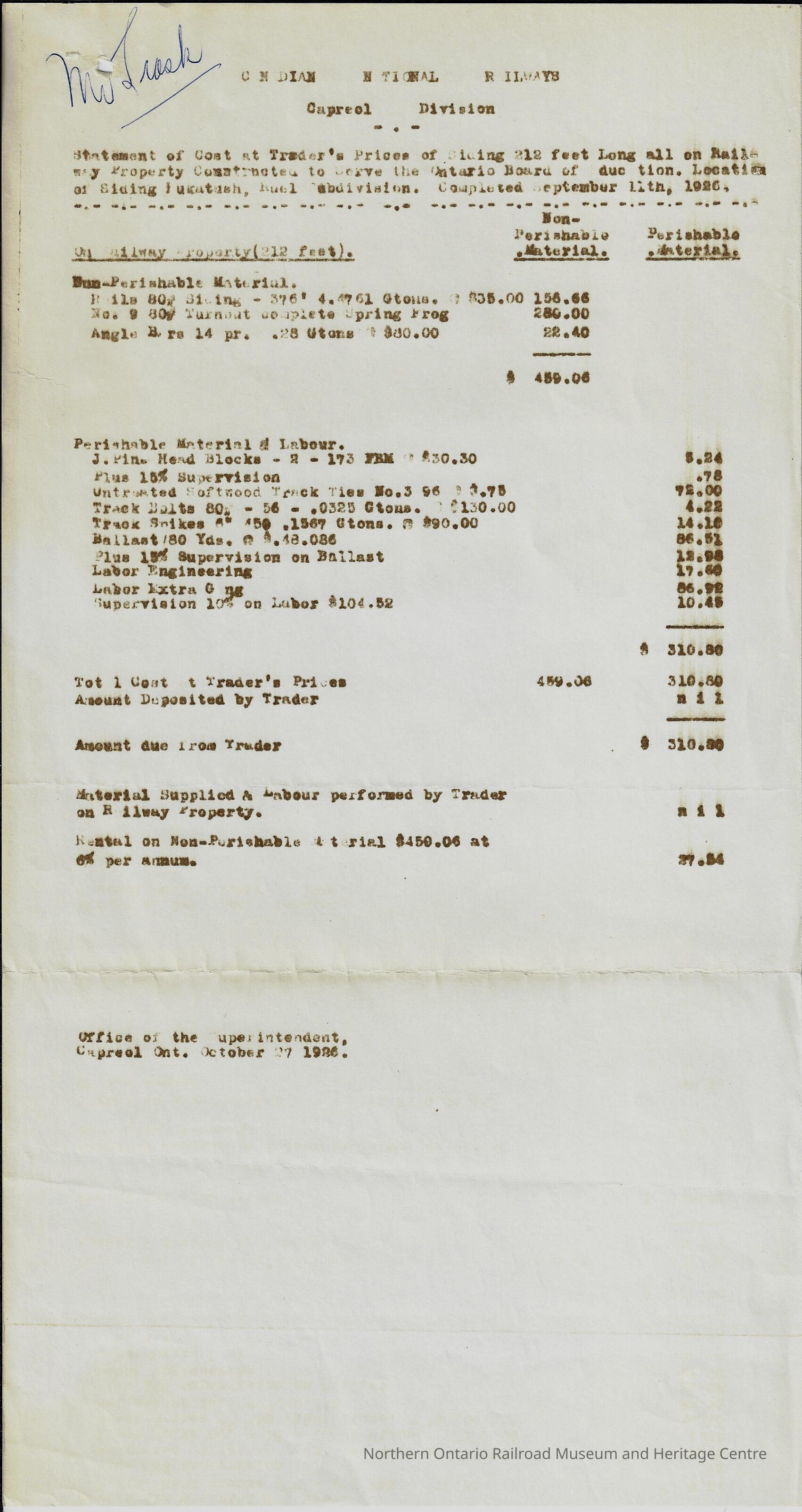 Statement of Costs for the Capreol Division of Canadian National as of September 11th, 1926. The statement tallies up all of the expenses for siding 212 feet long on all railway property constructed to serve the Ontario Board of Education. The amount for the nonperishable material came to $459.06, the amount for perishable material came to $310.89, there is also a charge for rental on nonperishable material $459.06 at 6% per annum totaling to $37.54.