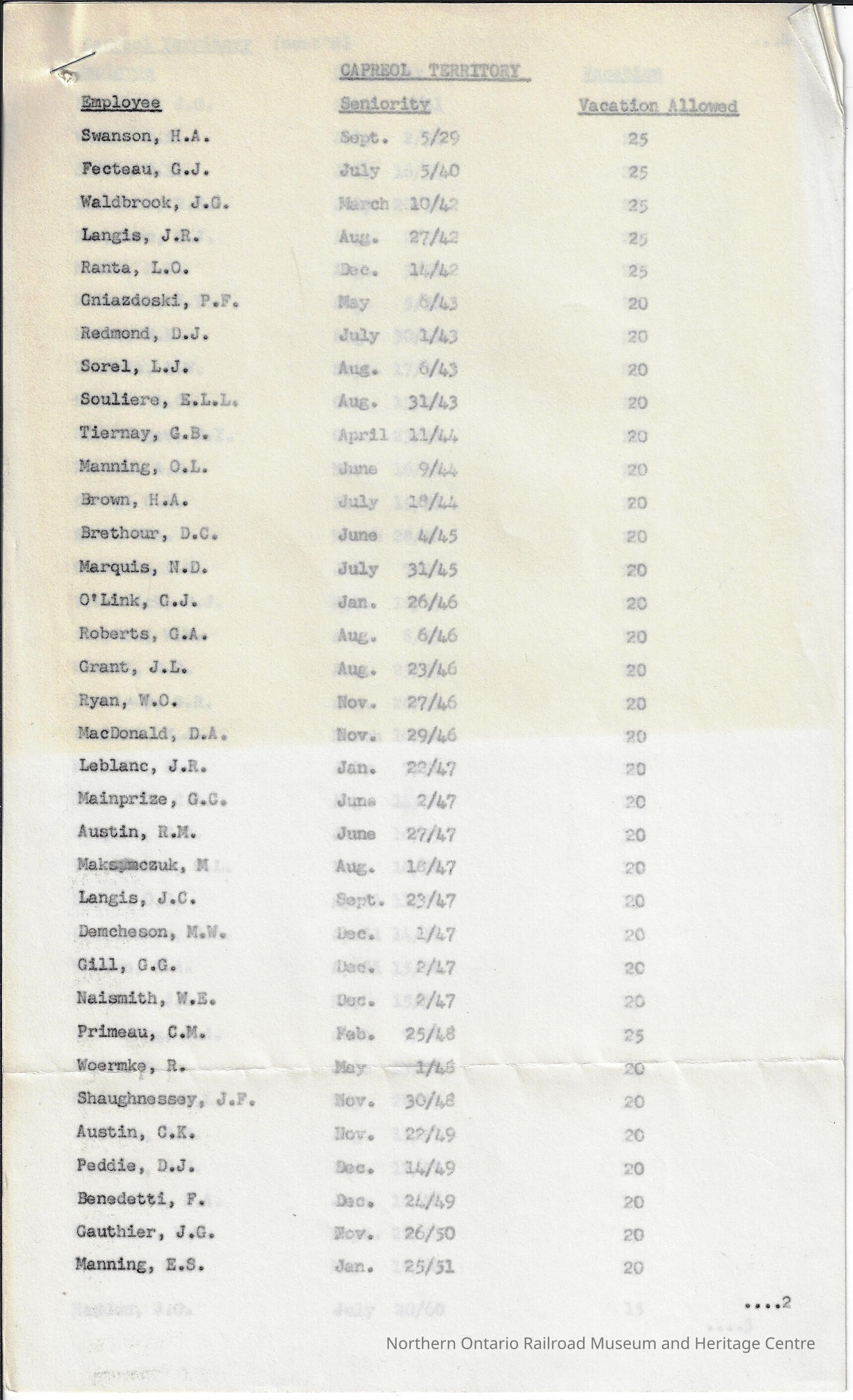List of employees in the Capreol Territory. The list is organized by seniority, with the highest being at the top. The list of seniority ranges from 1929 to 1972. The list lists: employee's name, seniority, and the amount of vacation days they are allowed per year.