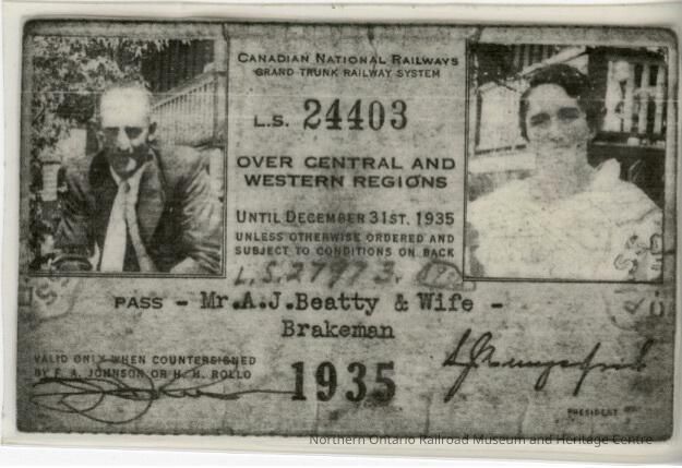 Canadian National branded central and western regions pass assigned to A. J. Beatty and his wife in 1935. Beatty was working as a brakeman at the time and was awarded the pass for having 15 years service with the company. The pass allowed the two to travel on any passenger trains on the CNR's central and western regions lines.
