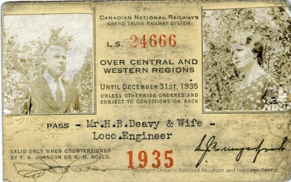 Canadian National branded central and western regions pass assigned to H. B. Deavy and his wife in 1935. Deavy was working as a locomotive engineer at the time and was given the pass for having worked for the company for 15 years. The pass allowed him and his wife to travel on any passenger train on the CNR central and western lines. It was valid from 1935 until 1936.