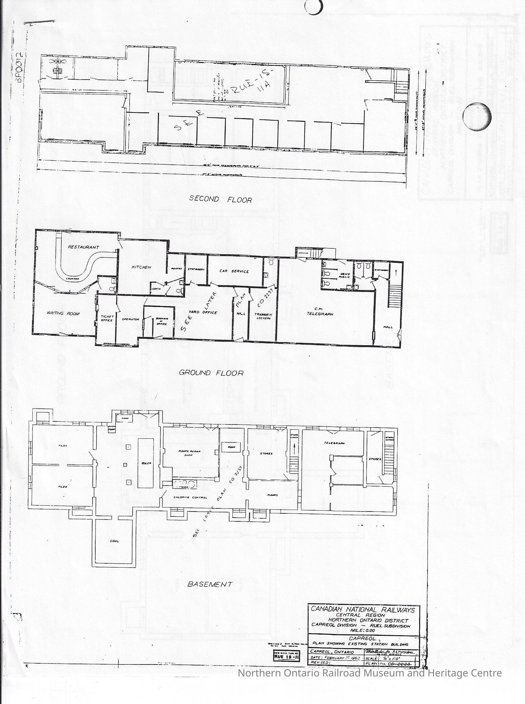 Plans published by Canadian National showing the existing station building in Capreol as of 1960. It is in the central region, northern Ontario district and it is a ruel subdivision in the Capreol district. The plans show the second floor, ground floor and basement layouts for the station building. The first page shows all three and the following two pages show each individual at a larger print. The plans were drawn on February 1st, 1960 at a scale of 1/4" = 1'-0". It was originally plan number Rue 15-11, later CD 22237.