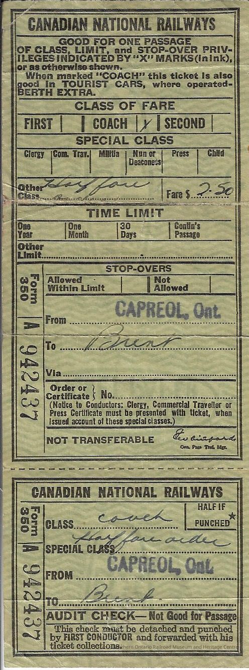 Passenger train ticket for a trip from Capreol Ontario to Brent Ontario and back.Creator