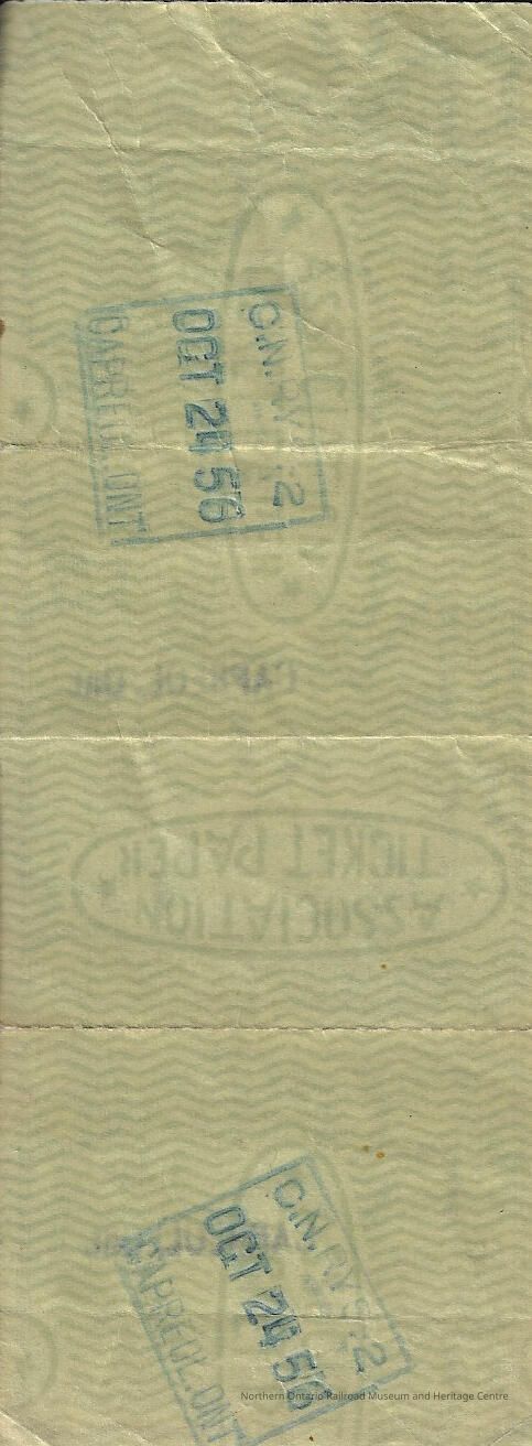 Canadian National branded coach class passenger train ticket. The ticket was for a trip from Capreol, Ontario to Brent, Ontario and back to Capreol. The trip was taken on October 24th, 1956.Context