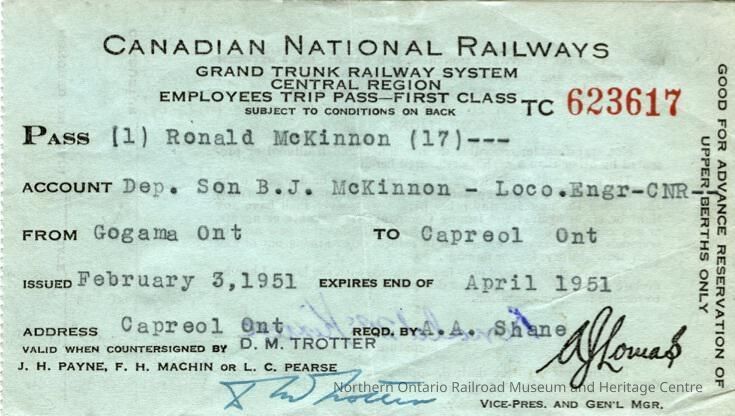 Canadian National branded issued dependent child of an employee trip pass. The pass was issued to Roland McKinnon, son of John Bergen McKinnon, a Canadian National locomotive fireman. The pass was valid for a round trip to Gogama On from Capreol ON and back to Capreol. It was issued on February 3, 1951 and had to be used by the end of April 1951.