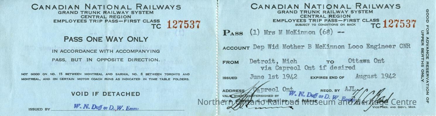 Canadian National branded issued dependent mother of an employee trip pass. The pass was issued to Mrs. McKinnon, mother of John Bergen McKinnon, a Canadian National locomotive fireman. The pass was valid for a trip to Detroit Michigan from Ottawa Ontario and back. It was issued on June 1st, 1942 and had to be used by the end of August 1942.
