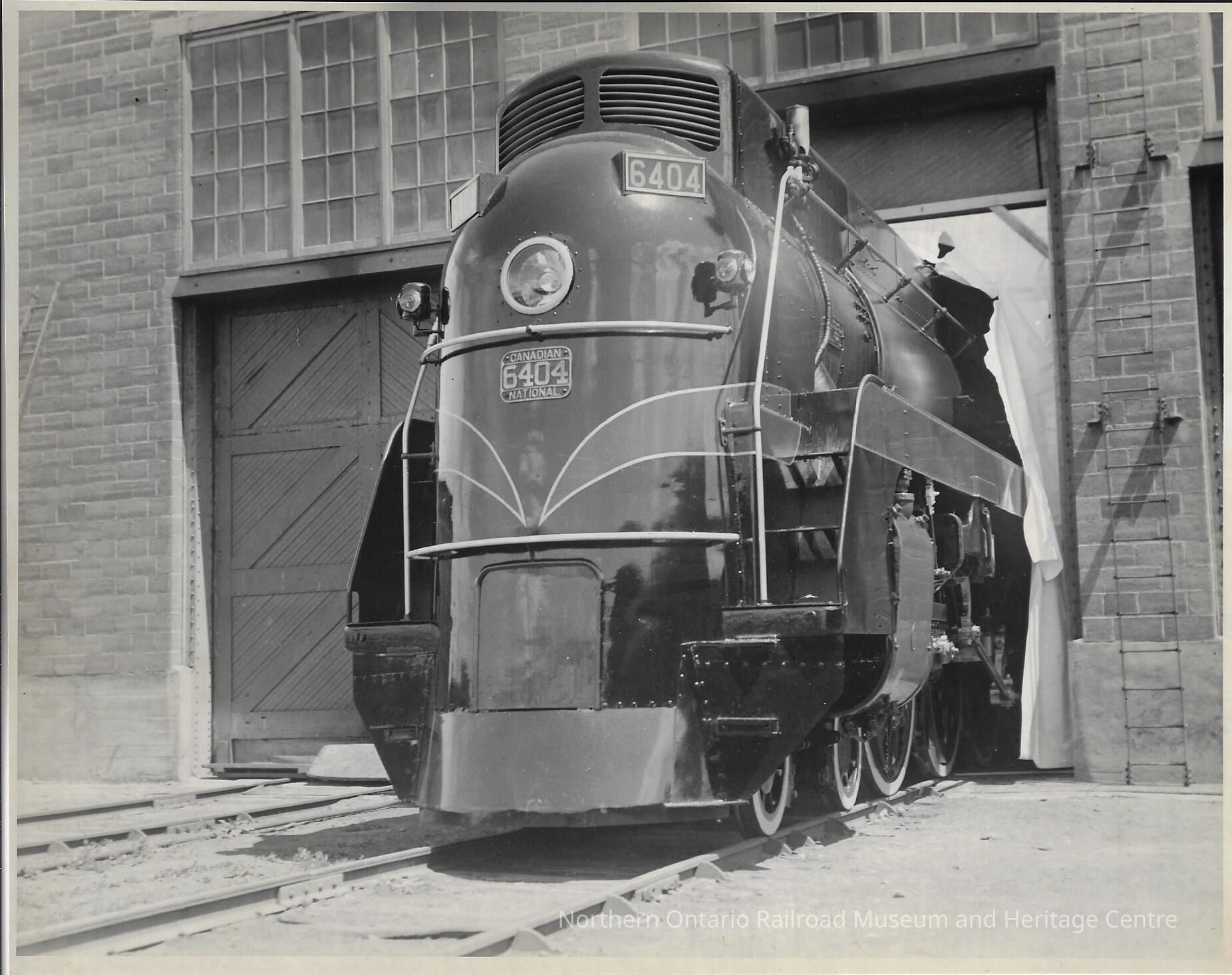 Original document, photograph showing Canadian National Diesel locomotive #6404 leaving Montreal Motor Works in 1937.