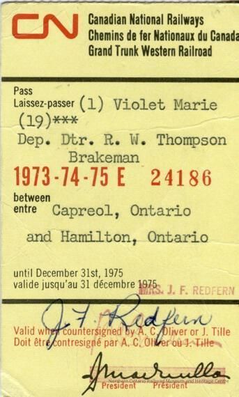 Canadian National: Employee Dependent Pass, Capreol to Hamilton, assigned to Violet Marie Thompson, daughter of R. W. Thompson, Brakeman, 1973Entry/Object ID