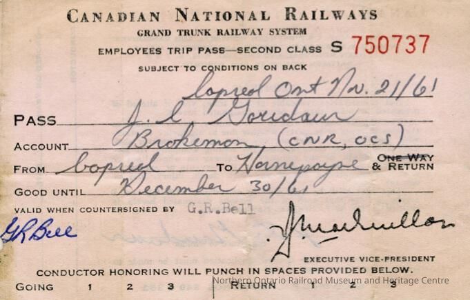 Canadian National branded employee trip pass assigned to J. C. (Joseph) Gaudaur in 1961. The trip pass was a first class trip from Capreol ON to Hornepayne ON. It was issued on November 21st, 1961 and had to be used by the end of December 1961.