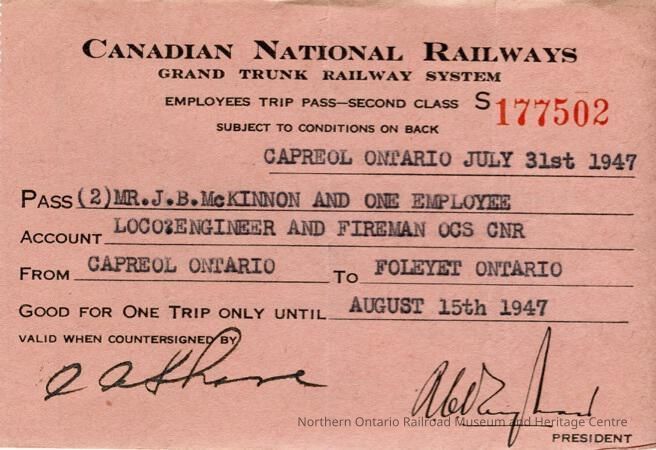 Canadian National branded employee trip pass issued to J. B. McKinnon, John Bergen McKinnon was a locomotive engineer, originally starting as a fireman. The ticket was a one way trip from Capreol to Foleyet, dated August 15th, 1947. It was good for McKinnon as well as one other employee.