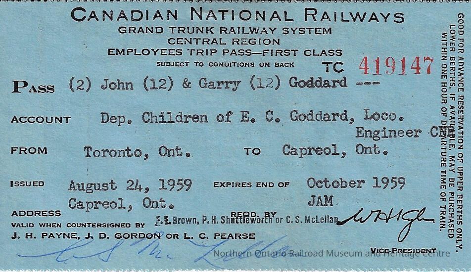 Canadian National branded employee trip pass assigned to John (age 2) and Garry (age 12) Goddard. Both of which are dependant children of E. C. Goddard, a locomotive engineer. The pass was assigned on August 25th, 1959 and it was valid until the end of October 1959. It was for a first class trip from Capreol Ontario to Toronto Ontario and back.Context