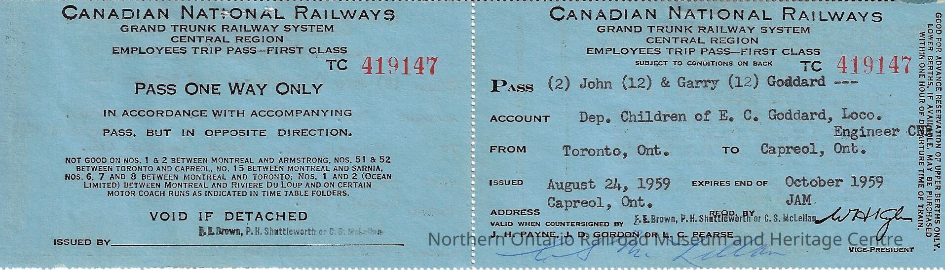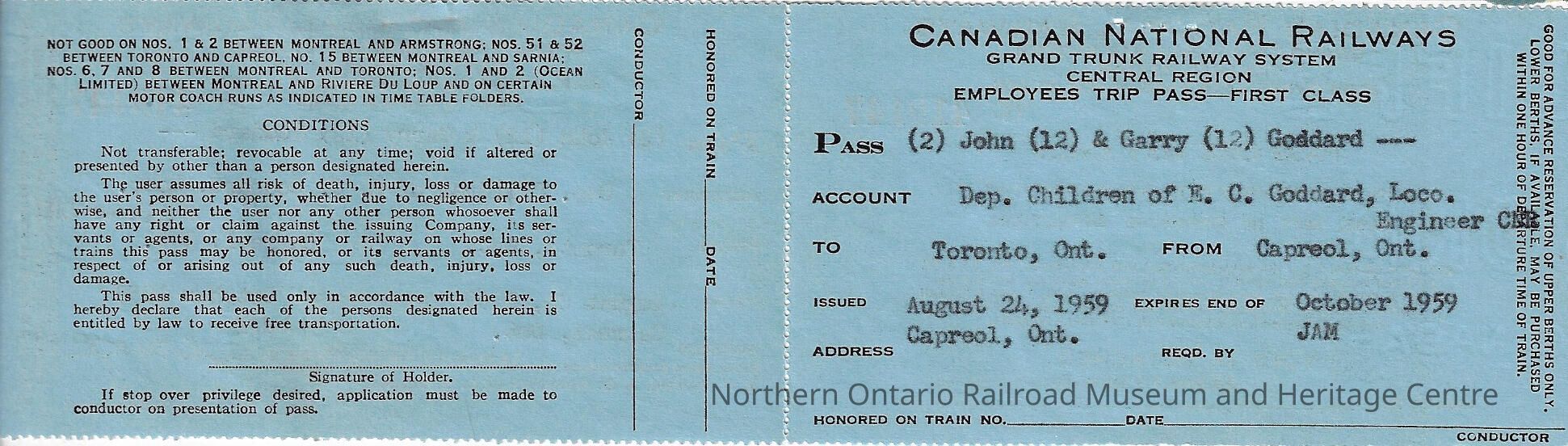 Canadian National: Employee Trip Pass, Dependents, Toronto ON to Capreol ON and back, John and Garry Goddard, sons of E. C. Goddard, 1959Entry/Object ID