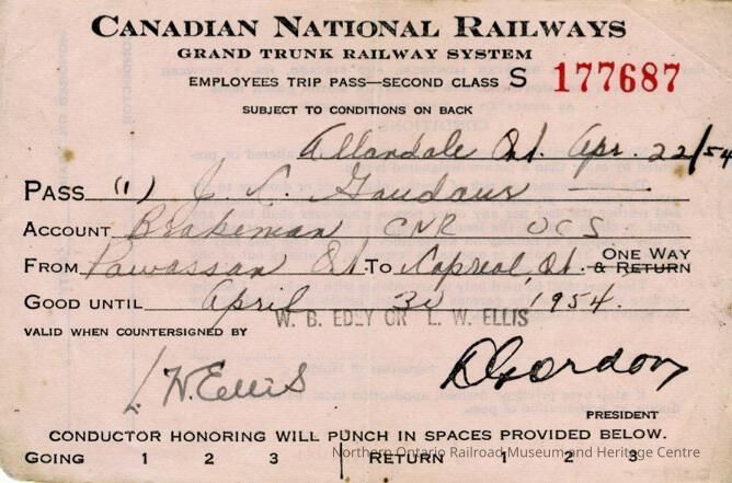 Canadian National branded employee trip pass assigned to J. C. (Joseph) Gaudaur in 1961. The trip pass was a second class trip from Powassan ON to Capreol ON. It was issued on April 22nd, 1954 and had to be used by the end of April 30th, 1954.