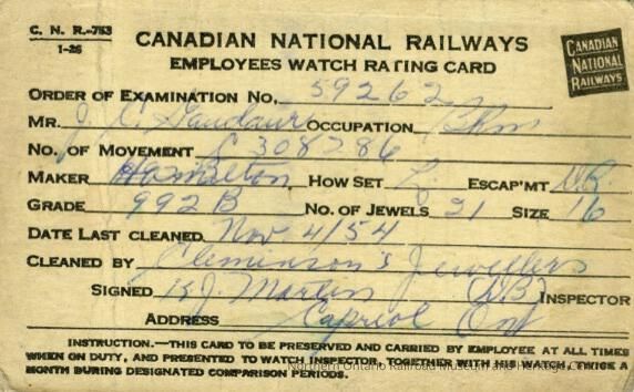 Canadian National branded employee watch rating card. The card was used to record the results of watch inspections, this one was for J. C. (Joseph) Gaudaur's watch, inspected on November 4th, 1954. Gaudaur was working as a brakeman at the time.