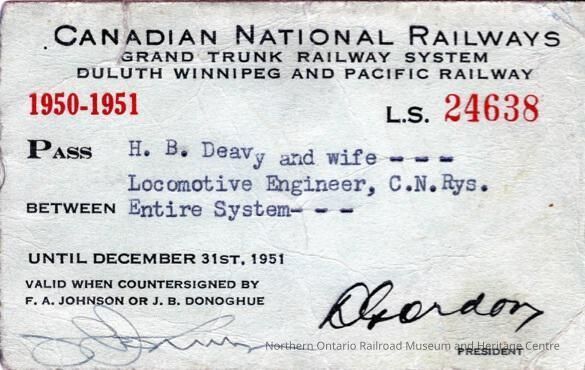 Canadian National branded entire system pass assigned to H. B. Deavy and his wife in 1950. Deavy was working as a locomotive engineer at the time and was given the pass for having worked for the company for 20 years. The pass allowed him and his wife to travel on any passenger train on the CNR lines. It was valid from 1950 until 1951.
